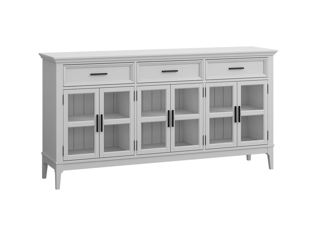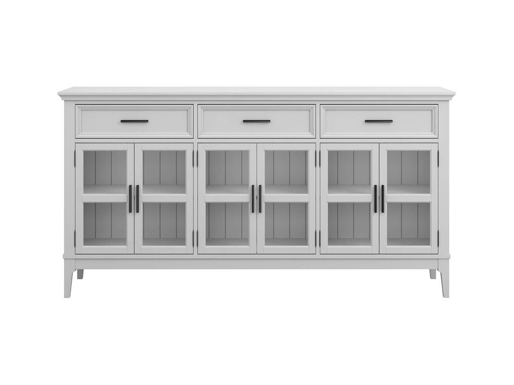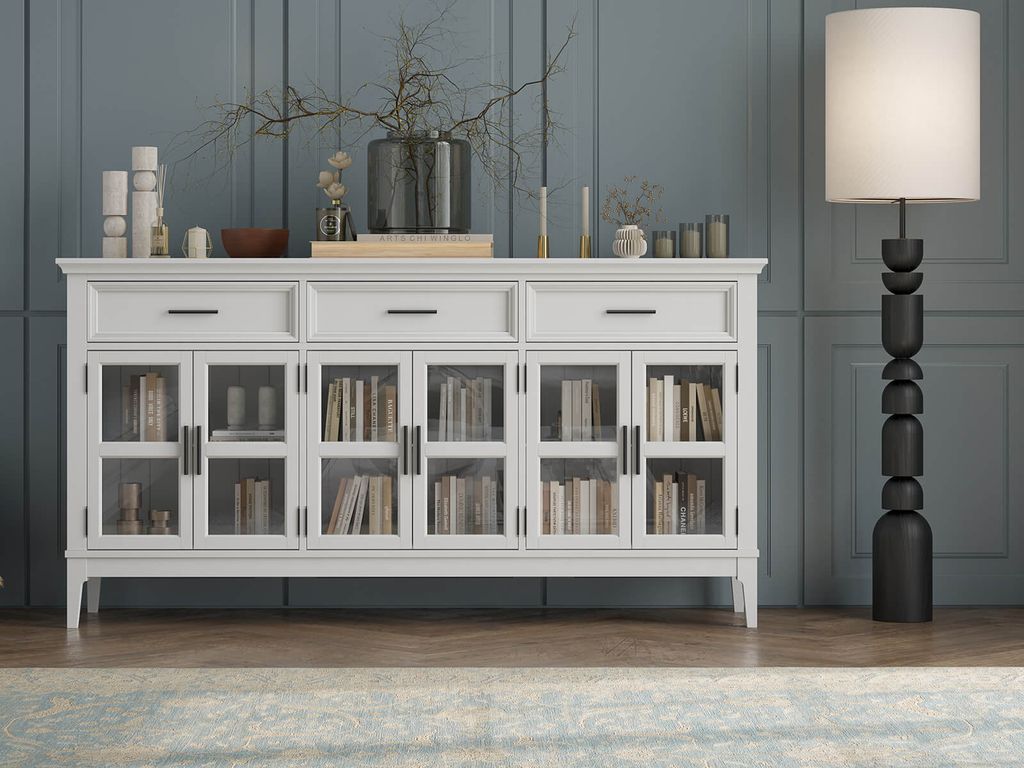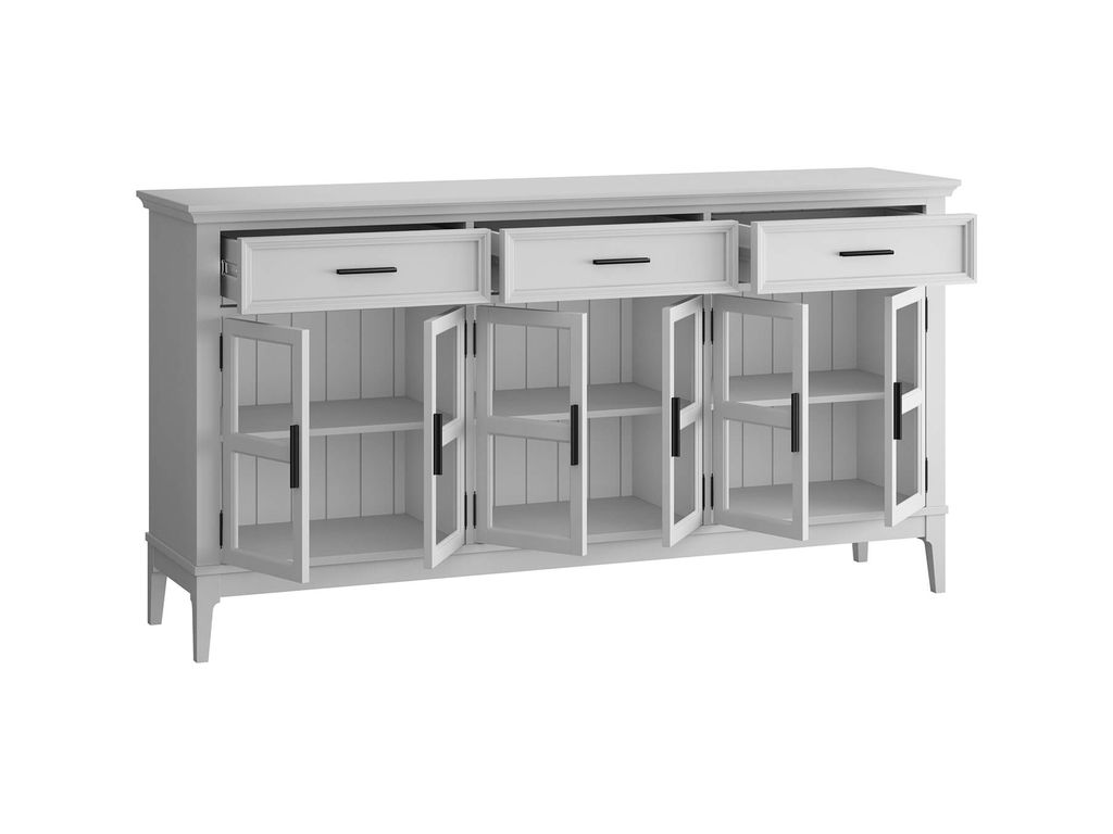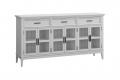 Описание: широкая и вместительная тумба. Состоит из трех вместительных отделений с полками за распашными, стеклянными дверками, сверху три выдвижных ящика. Подойдет как для прихожей, спальни или гостиной в городской квартире, так и для загородного дома.