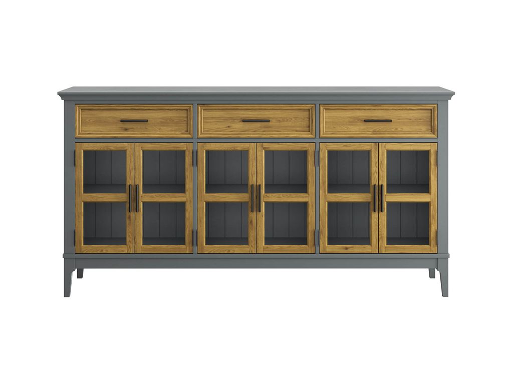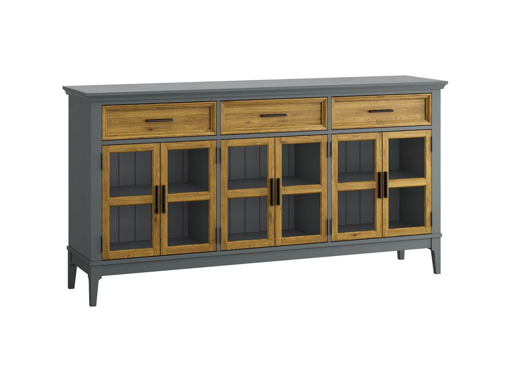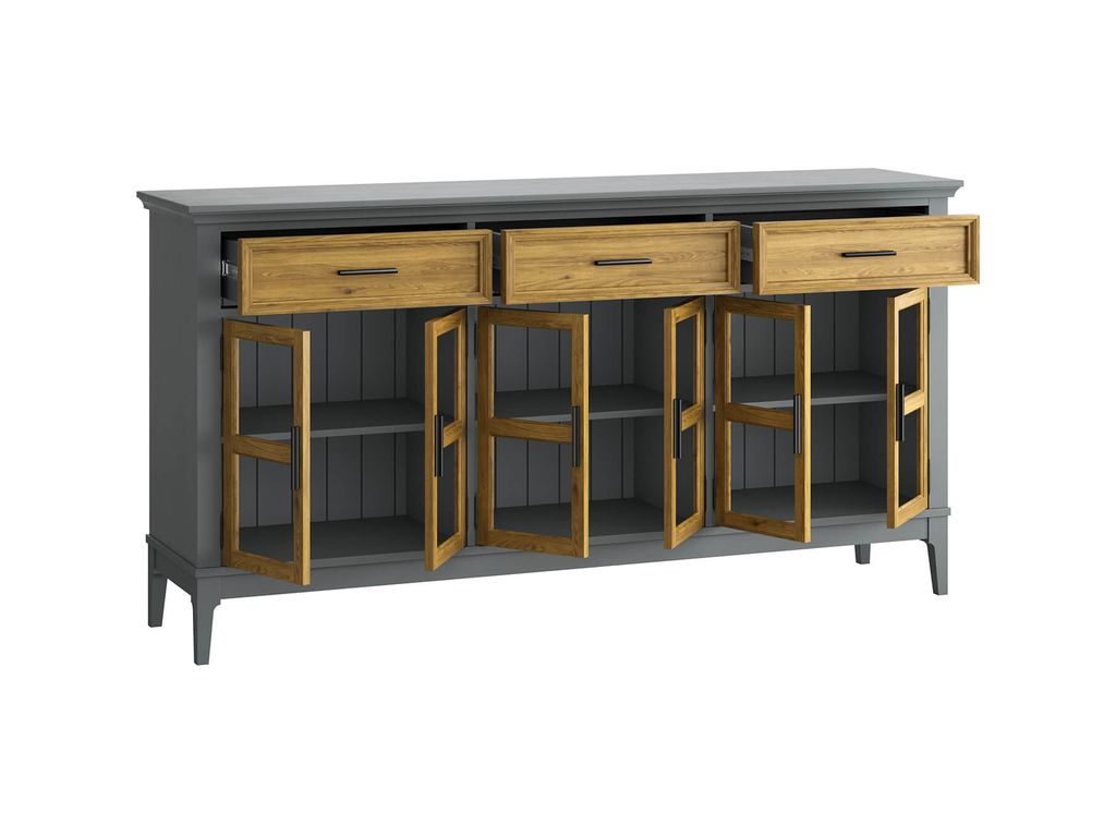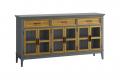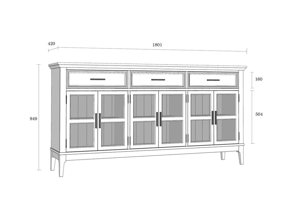Описание: широкая и вместительная тумба. Состоит из трех вместительных отделений с полками за распашными, стеклянными дверками, сверху три выдвижных ящика. Подойдет как для прихожей, спальни или гостиной в городской квартире, так и для загородного дома.