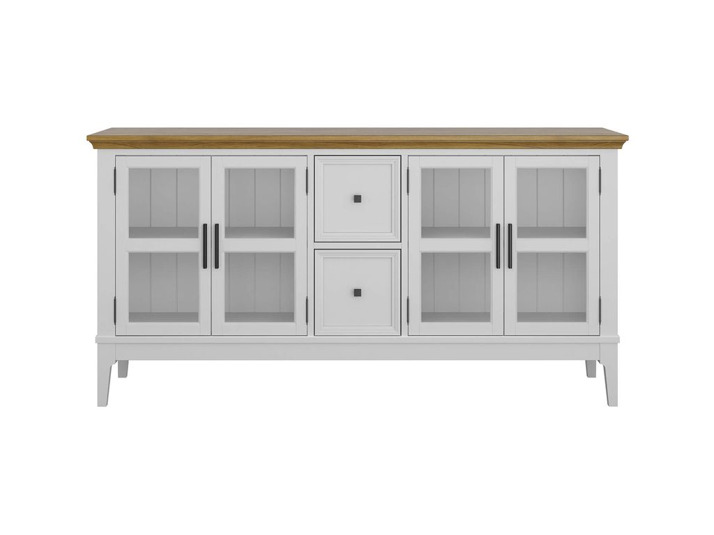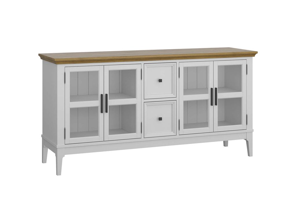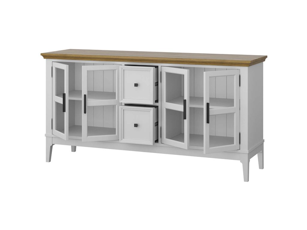 Описание: тумба ТВ состоит из двух отсеков за четырьмя стеклянными дверками и двумя выдвижными ящиками посередине. Внутри две широкие полки.