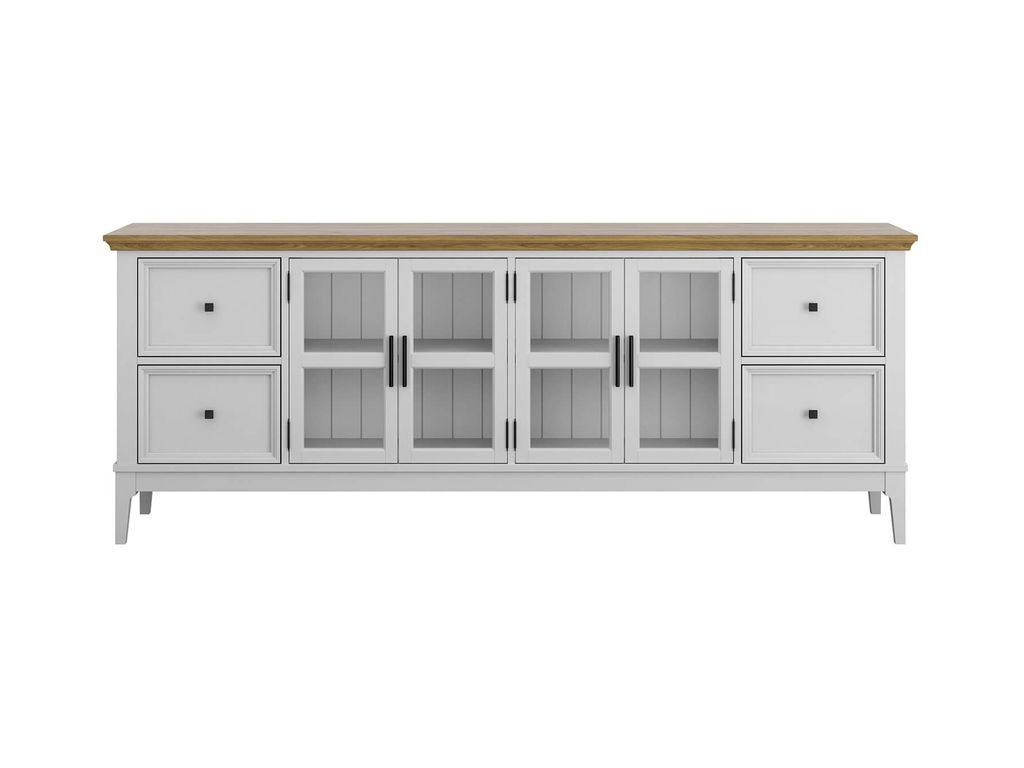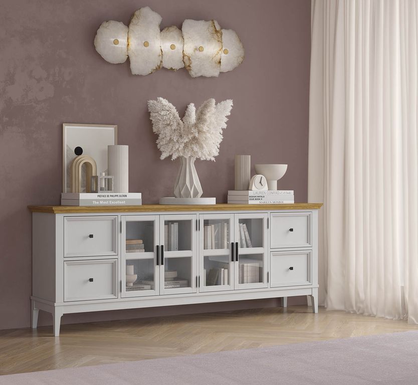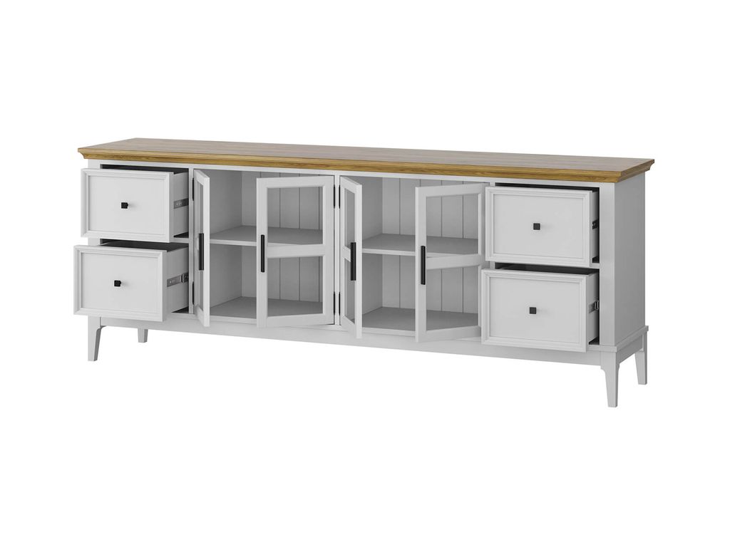 Описание: тумба ТВ состоит из двух отсеков за четырьмя стеклянными дверками и четырьмя выдвижными ящиками по бокам. Внутри две широкие полки.