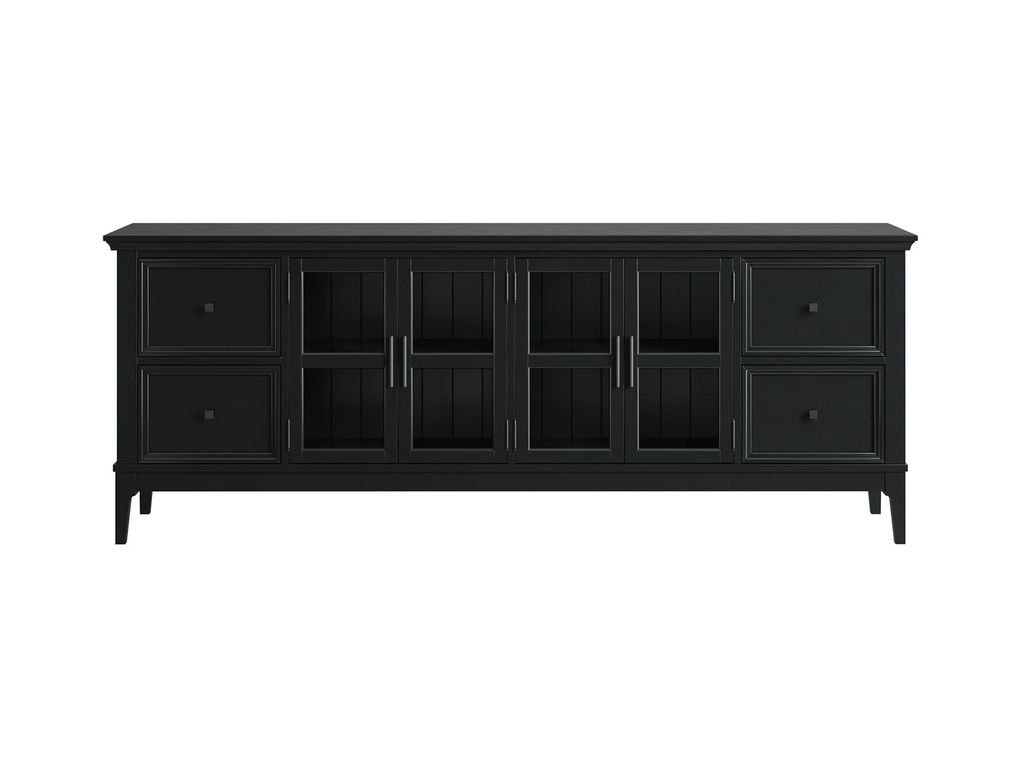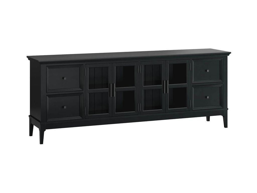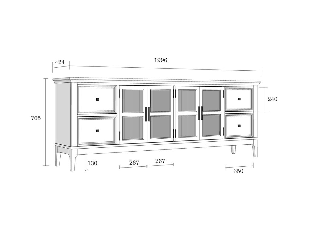 Описание: тумба ТВ состоит из двух отсеков за четырьмя стеклянными дверками и четырьмя выдвижными ящиками по бокам. Внутри две широкие полки.