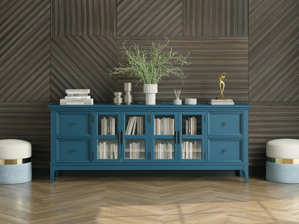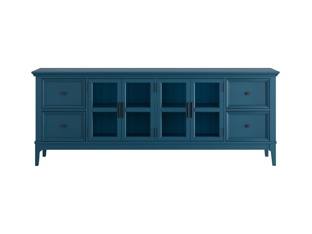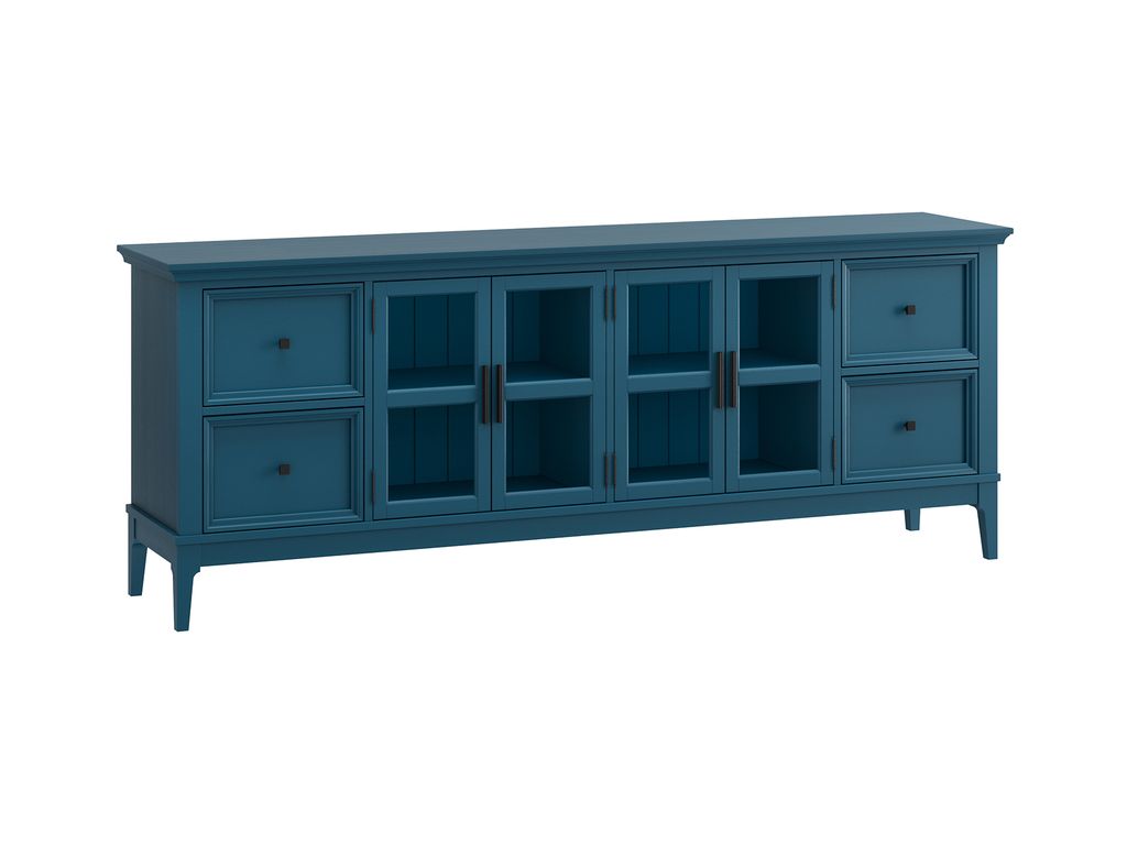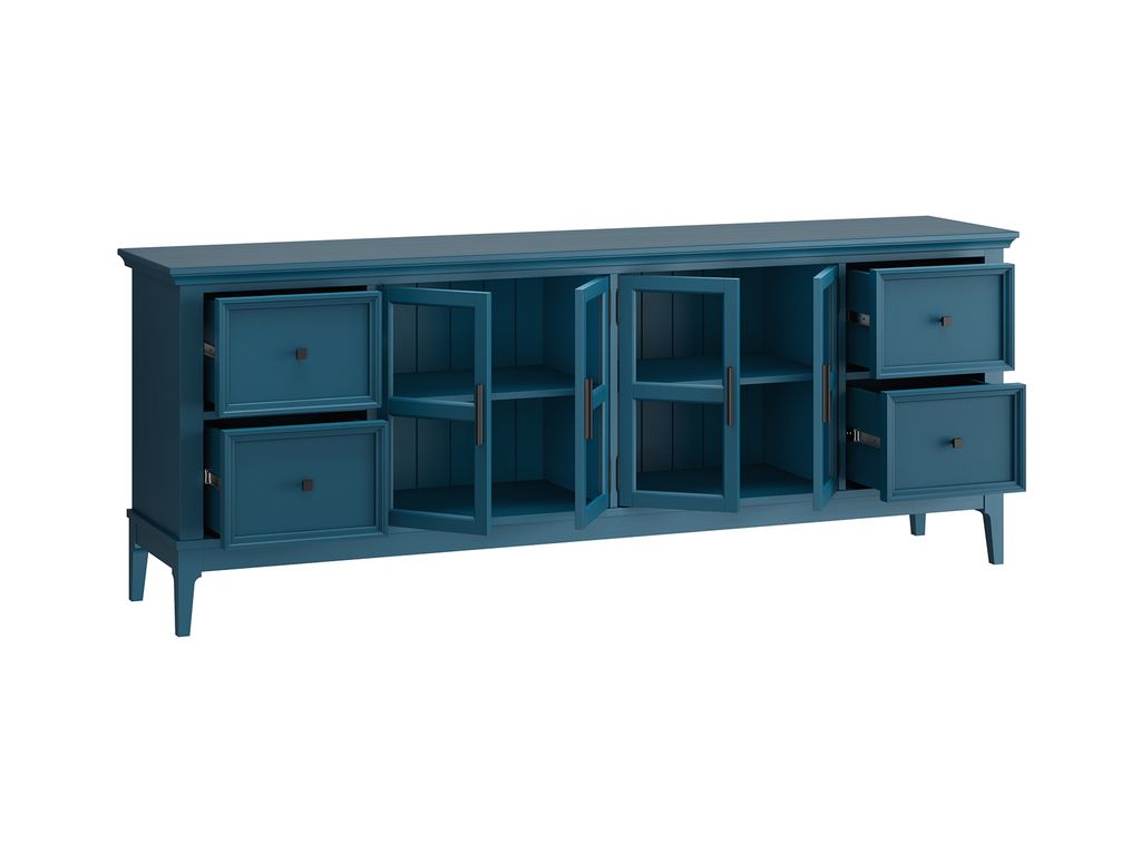 Описание: тумба ТВ состоит из двух отсеков за четырьмя стеклянными дверками и четырьмя выдвижными ящиками по бокам. Внутри две широкие полки.