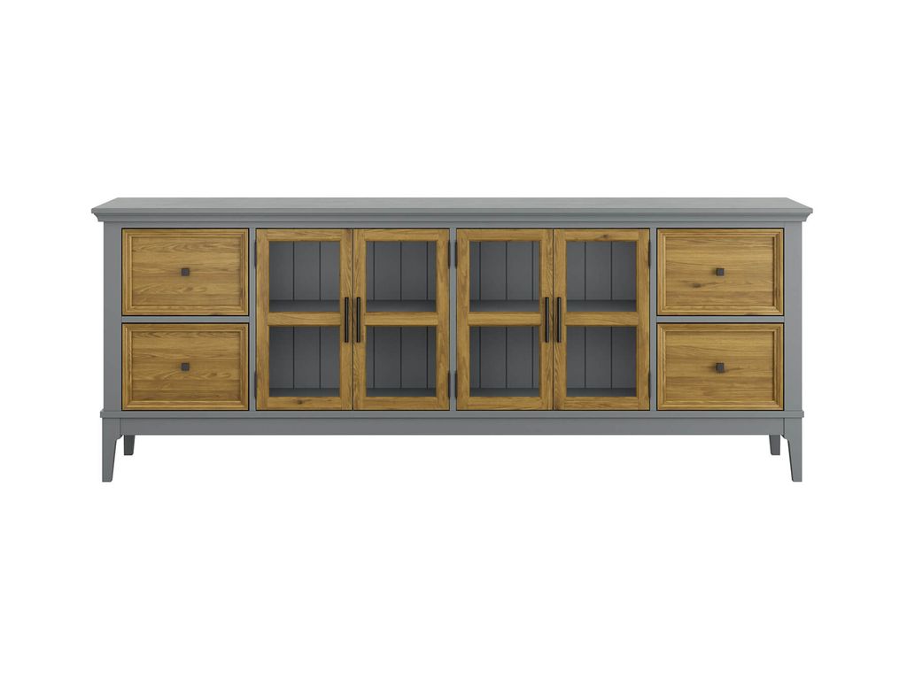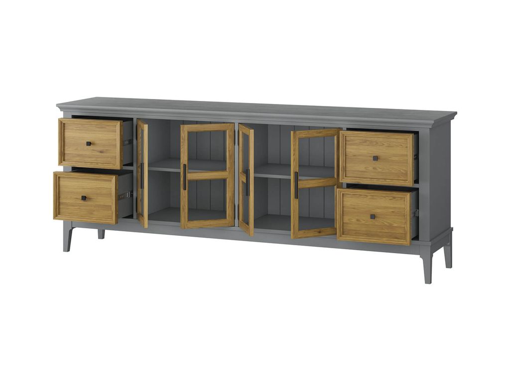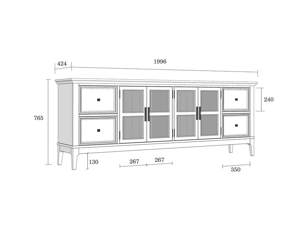 Описание: тумба ТВ состоит из двух отсеков за четырьмя стеклянными дверками и четырьмя выдвижными ящиками по бокам. Внутри две широкие полки.