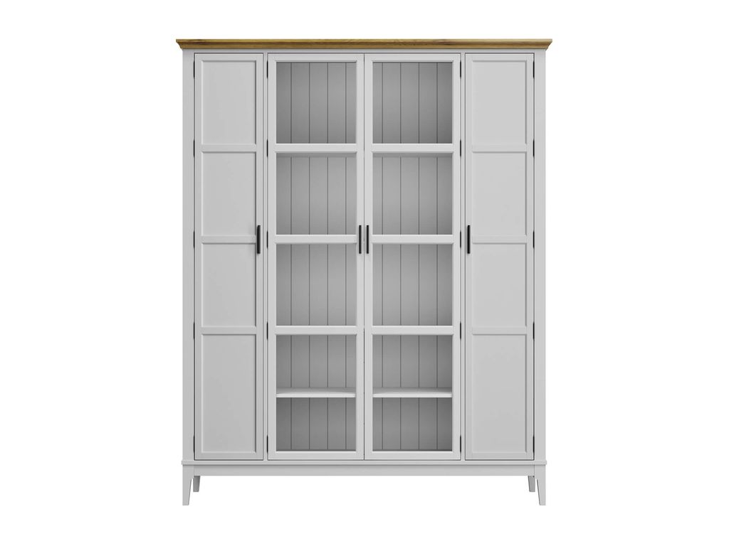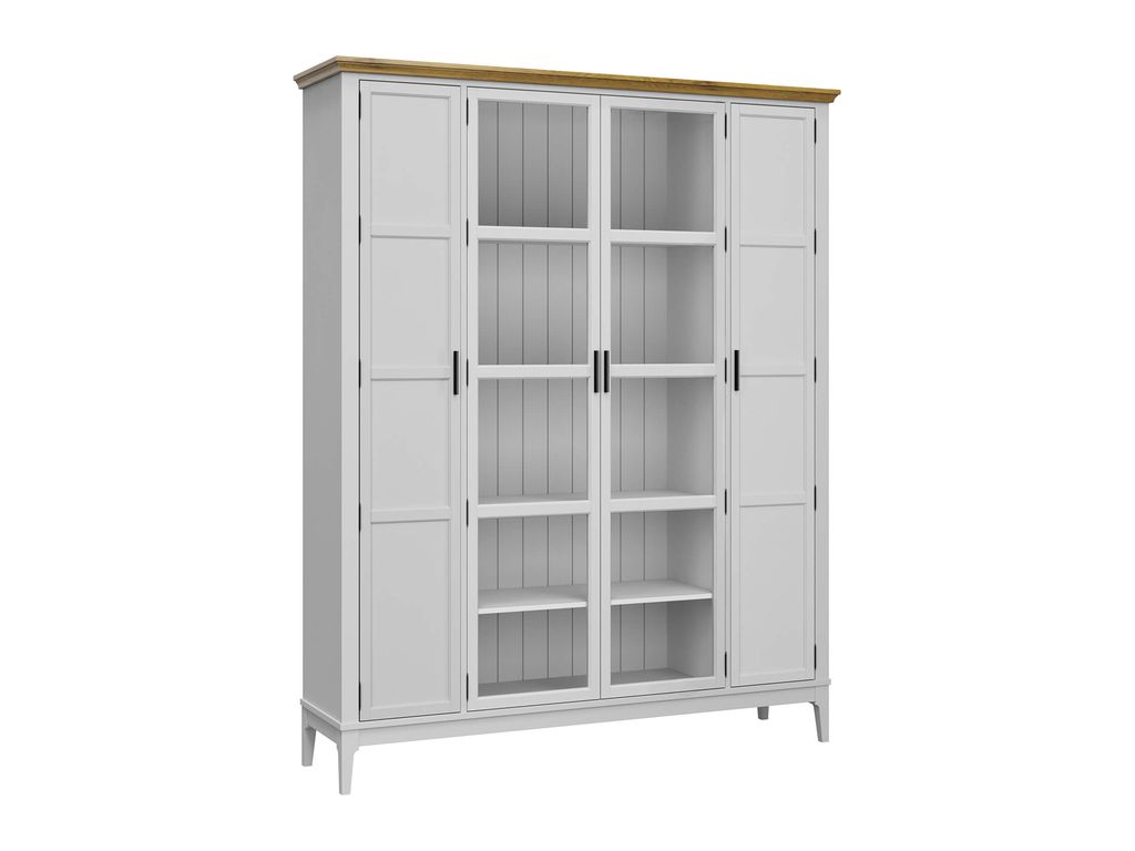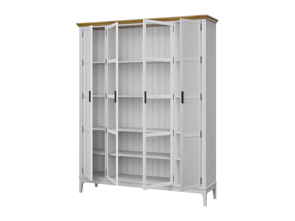 Описание: высокий шкаф с распашными стеклянными дверями и дверями филенкой, четырьмя широкими и восемью узкими полками.