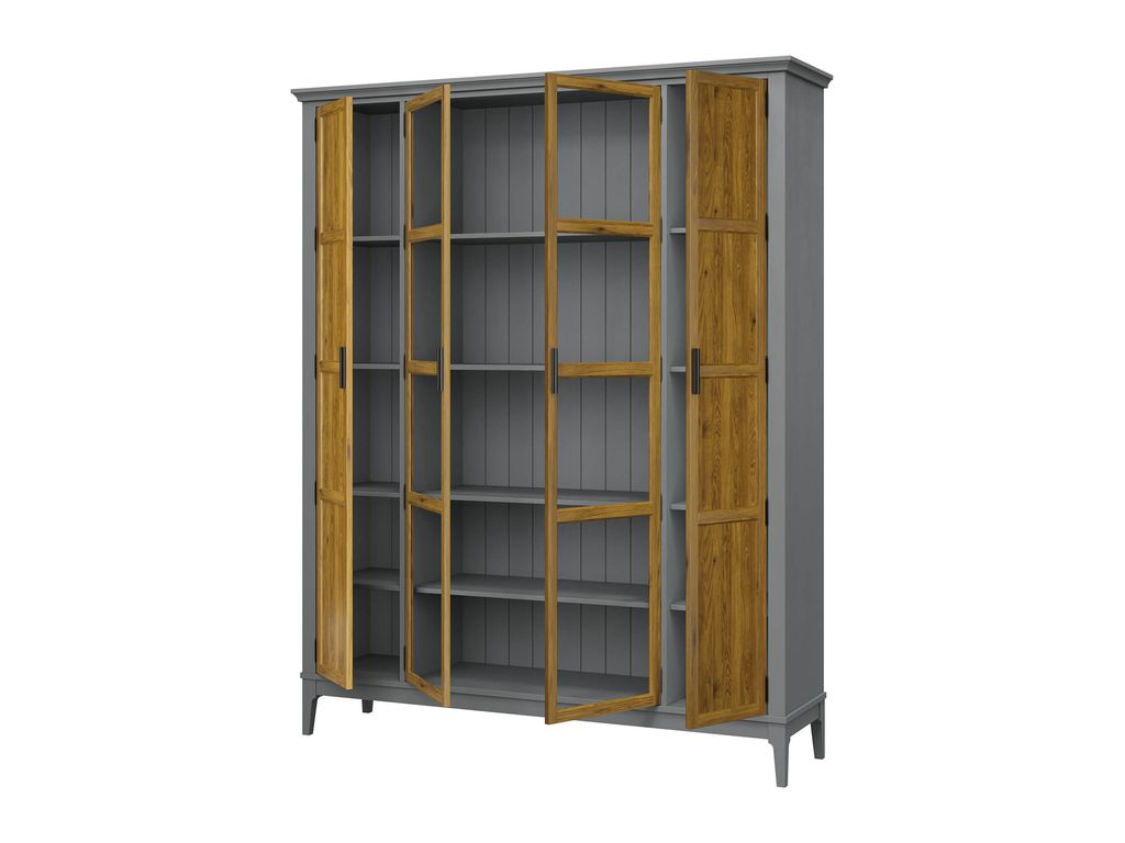 Описание: высокий шкаф с распашными стеклянными дверями и дверями филенкой, четырьмя широкими и восемью узкими полками.
