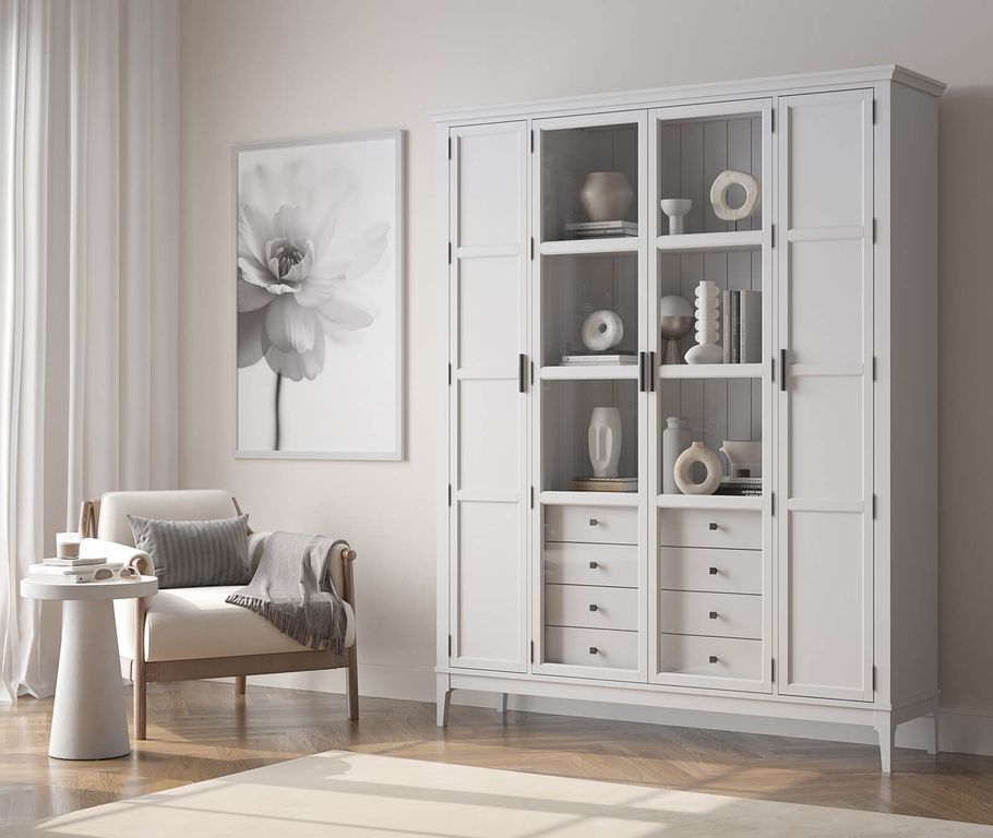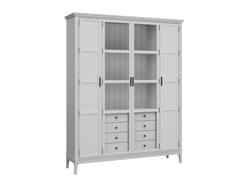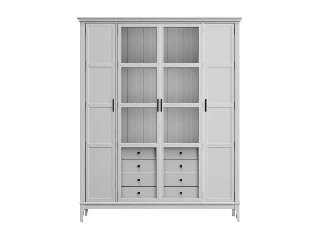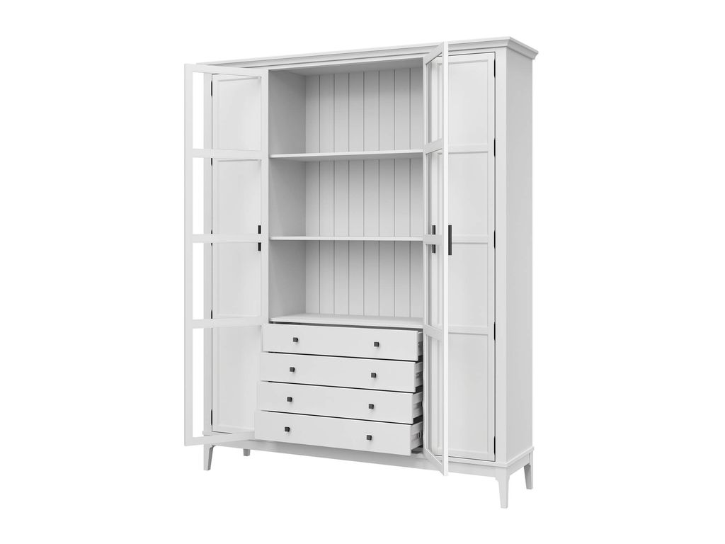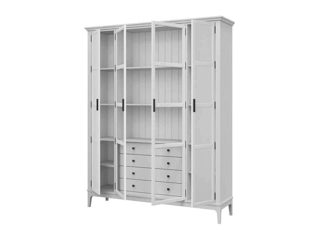 Описание: высокий шкаф с распашными стеклянными дверями и дверями филенкой. Внутри четыре ящика, три широкие и восемь узких полок.