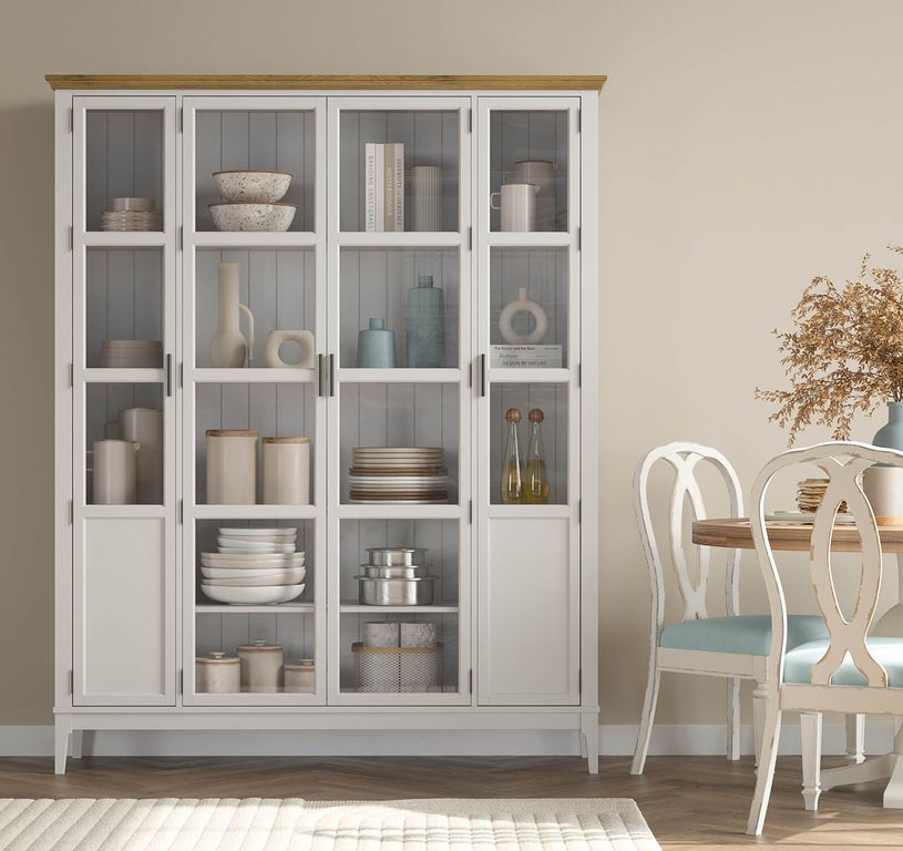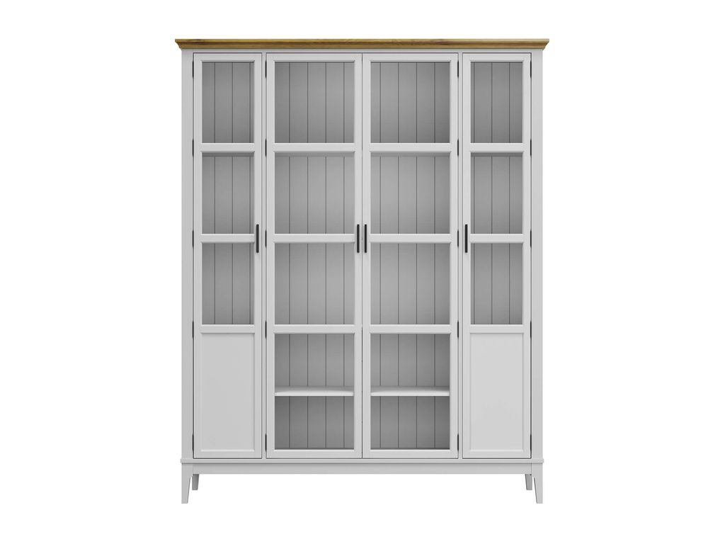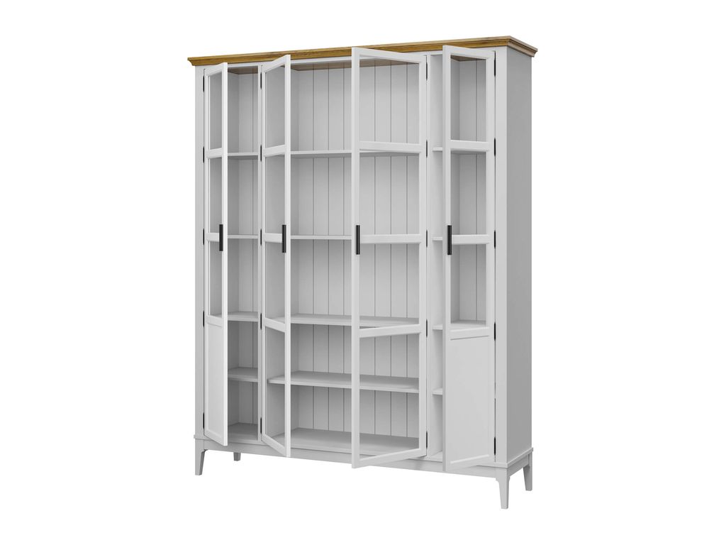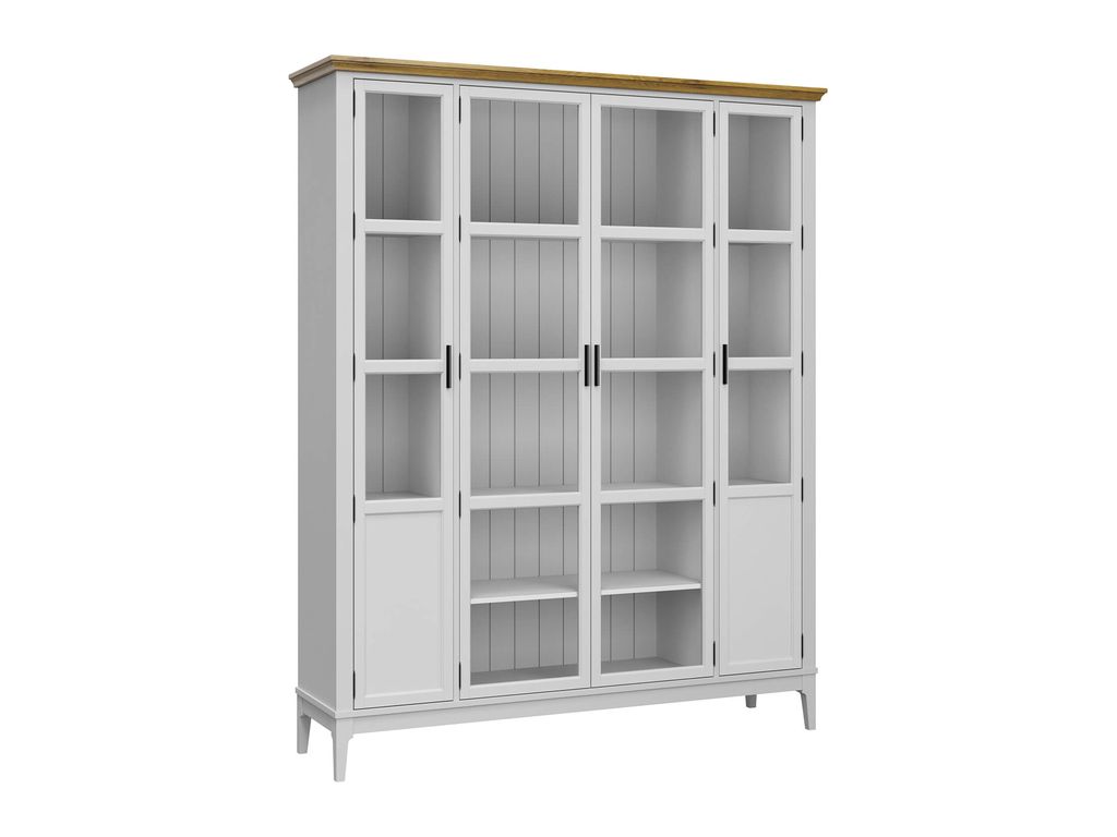 Описание: высокий шкаф с распашными стеклянными дверями, четырьмя широкими и восемью узкими полками.