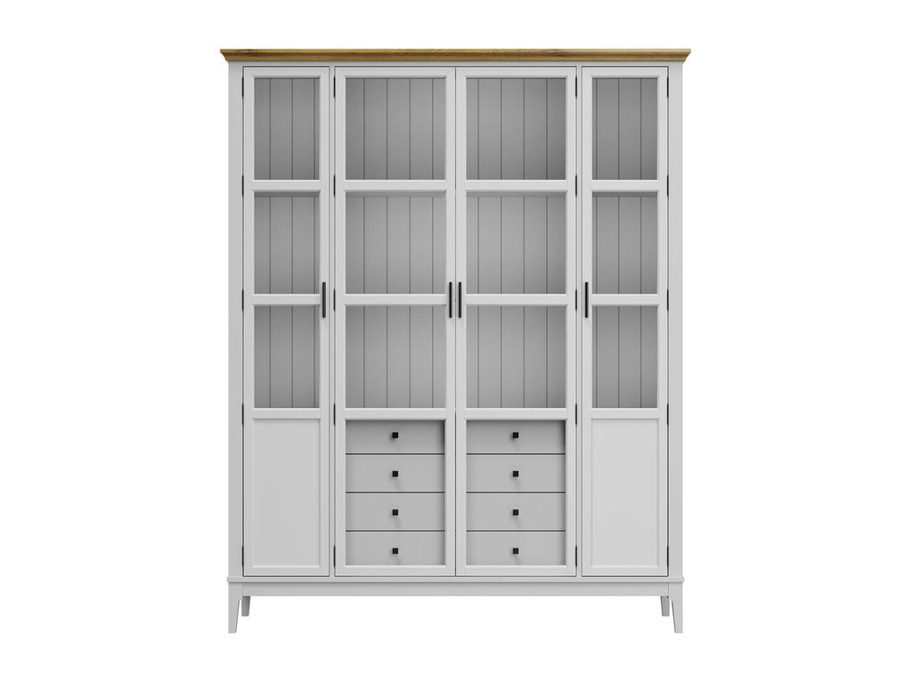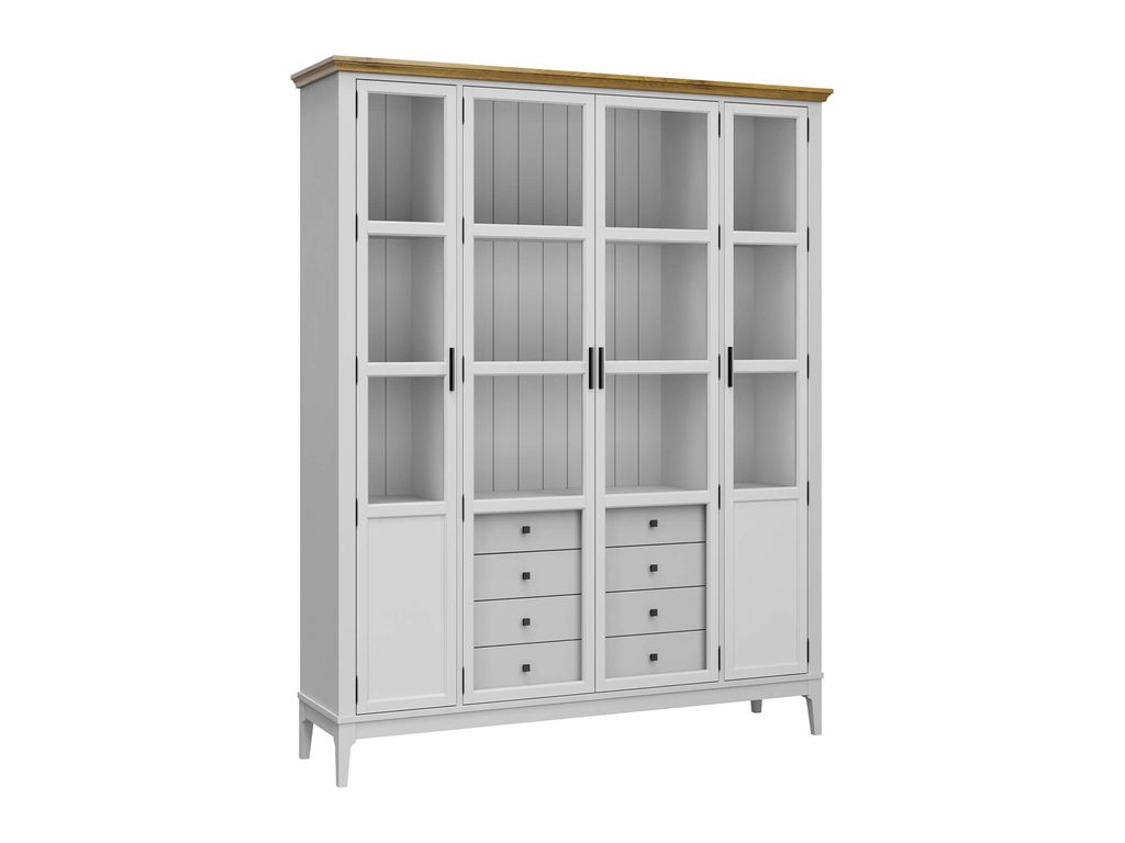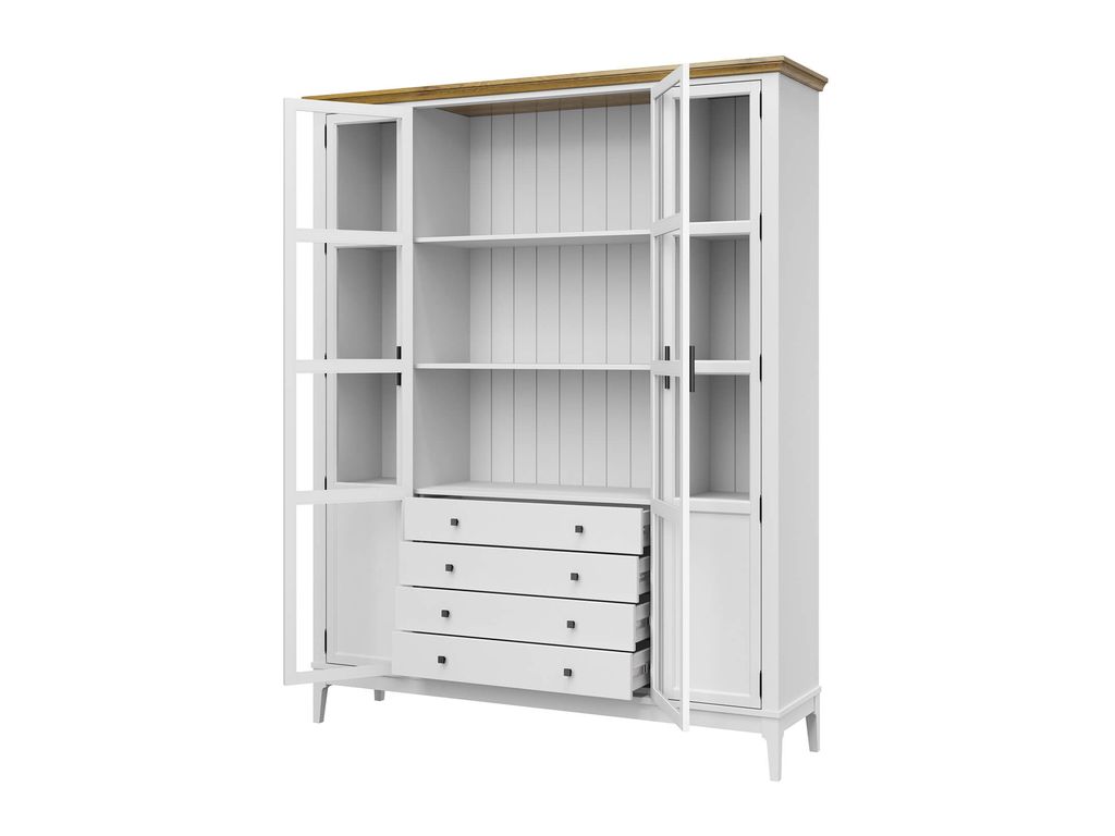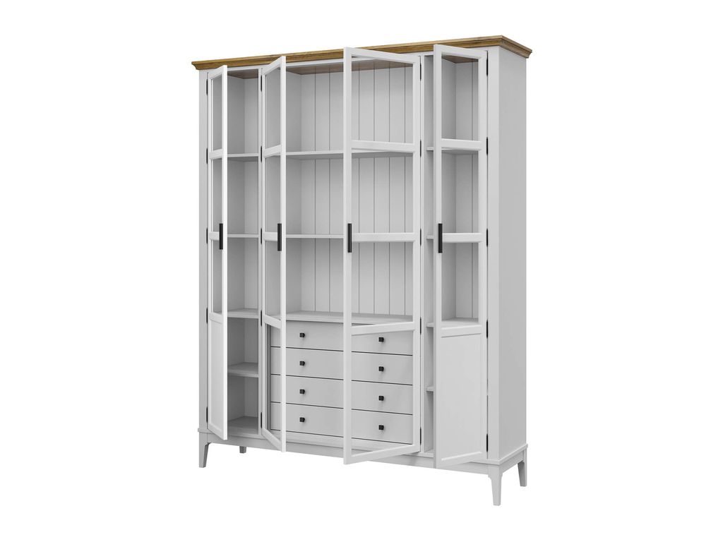 Описание: высокий шкаф с распашными стеклянными дверями. Внутри четыре ящика, три широкие и восемь узких полок.