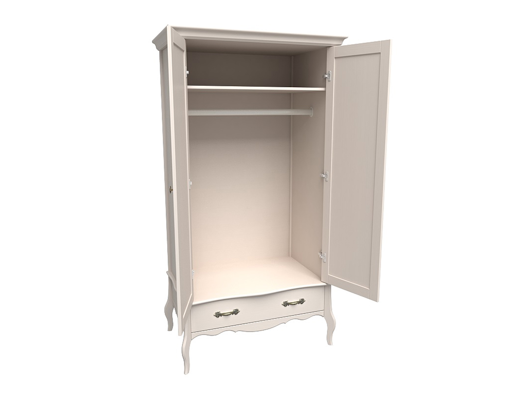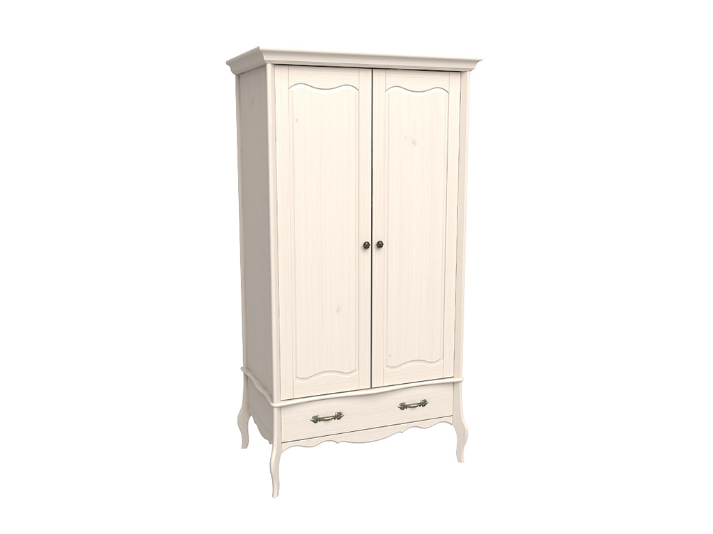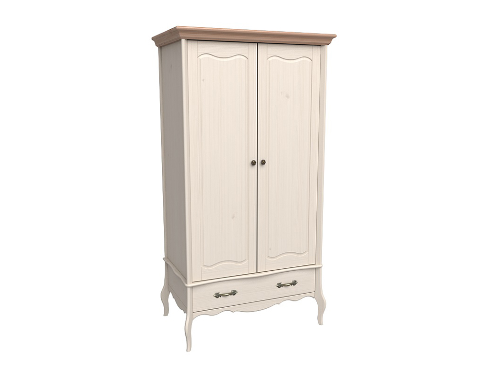 Описание: шкаф с 2 дверями и ящиком из массива сосны. Имеет одно отделение за дверями, полку и штангу под ней для одежды, ящик на направляющих Blum с доводчиками. Покрытие - укрывистый бежевый воск, структура древесины почти не просматривается. Возможна установка дополнительных полок и ящиков для белья (приобретаются отдельно).