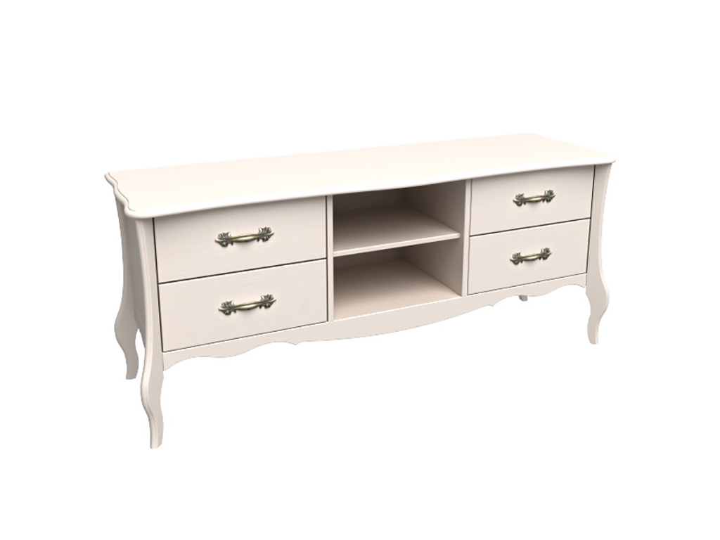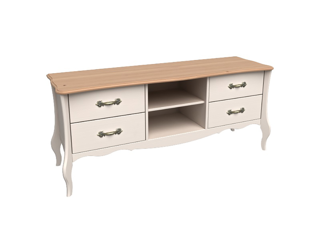Описание: изящная тумба под ТВ на резных ножках с 4 выдвижными ящиками на направляющих Blum с доводчиками и нишей под аппаратуру. Покрытие - укрывистый бежевый воск, структура древесины почти не просматривается.