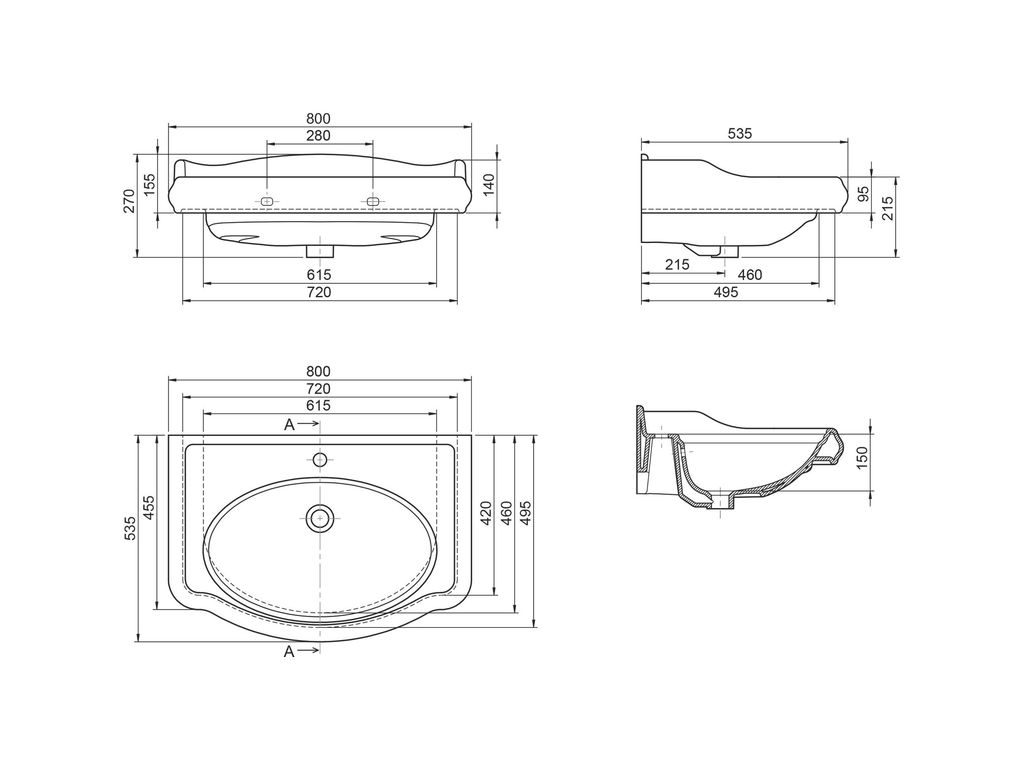 | Размер раковины (Ш×В×Г), мм | 800×270×535 |