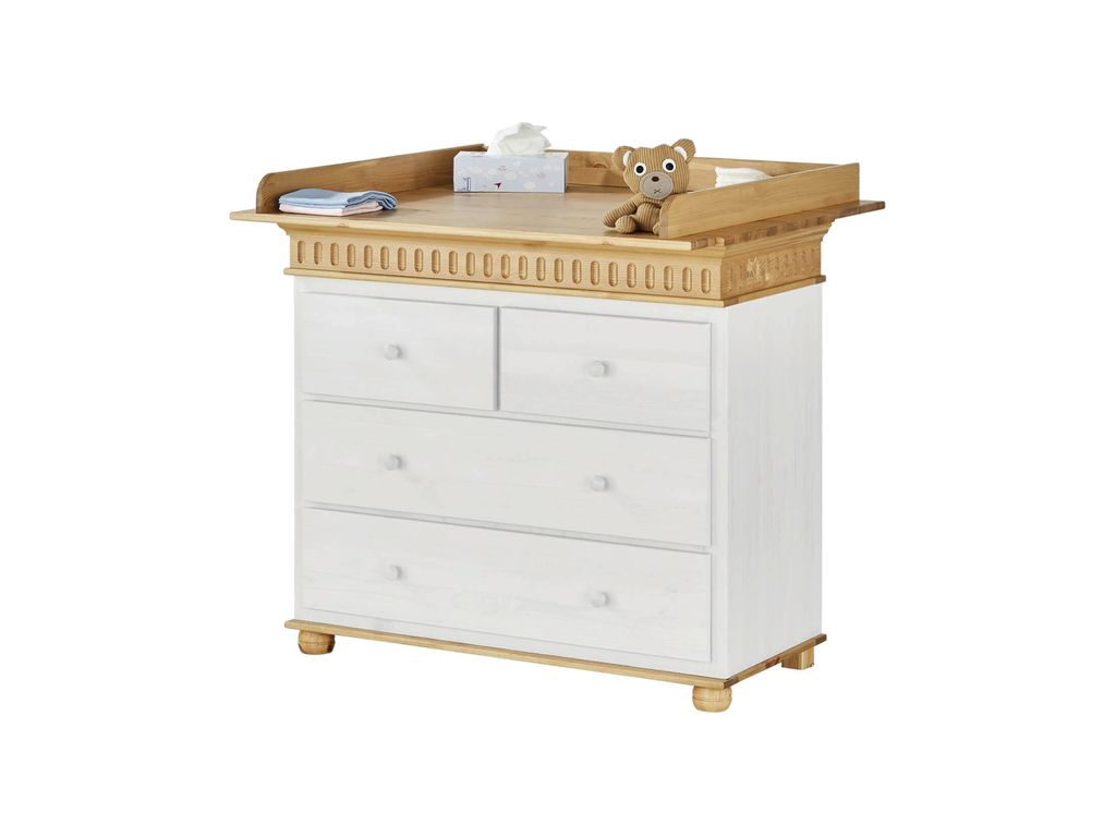 Описание: конструкция надстройки комода для пеленания позволяет легко организовать место для пеленания малыша. Надстройка выполнена из массива сосны с безопасным покрытием на водяной основе и устанавливается на столешницу детского комода. По мере роста ребенка столешница, также легко демонтируется, и комод используется для хранения вещей.