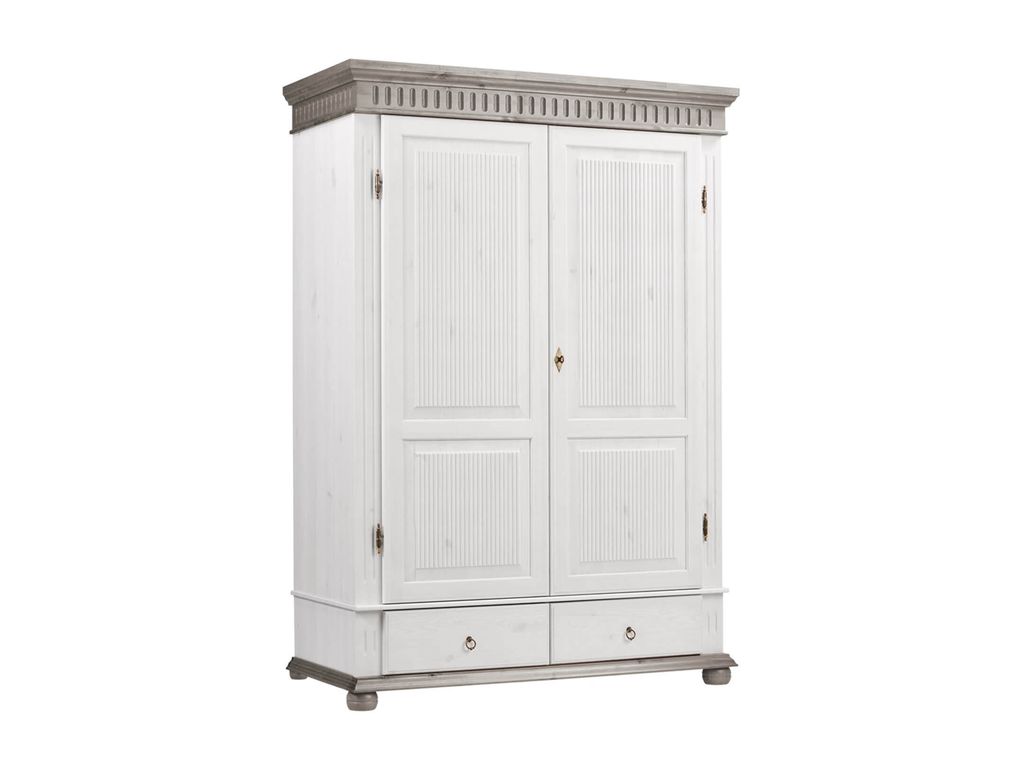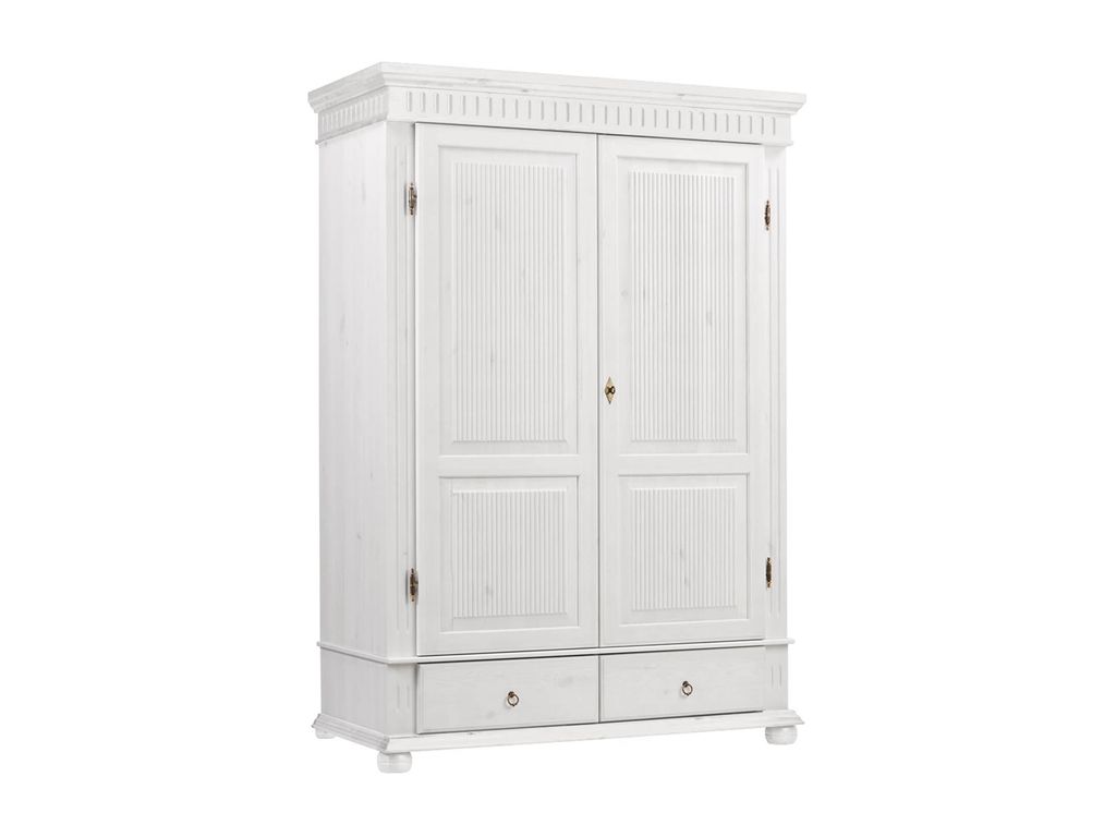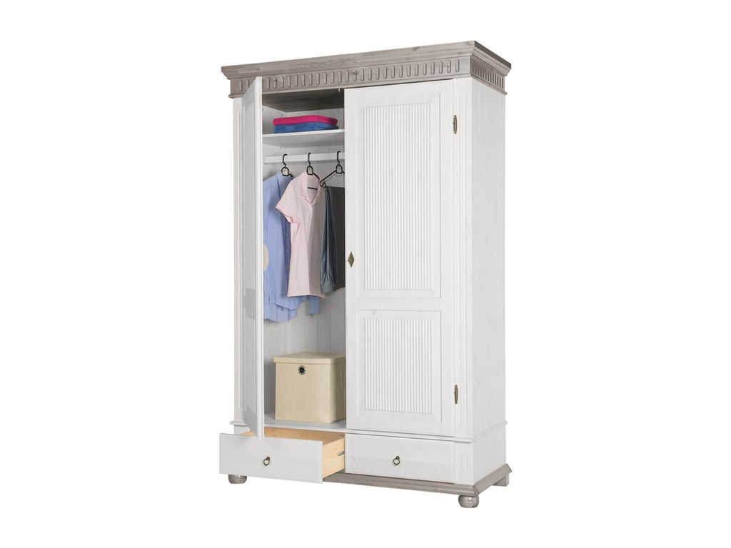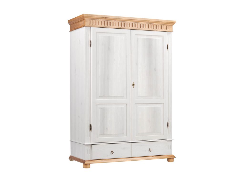 Описание: Двухдверный платяной шкаф из массива сосны. Высота шкафа 218 см. Две распашные двери скрывают вместительное пространство с полкой и штангой для одежды, а внизу находятся два выдвижных ящика.