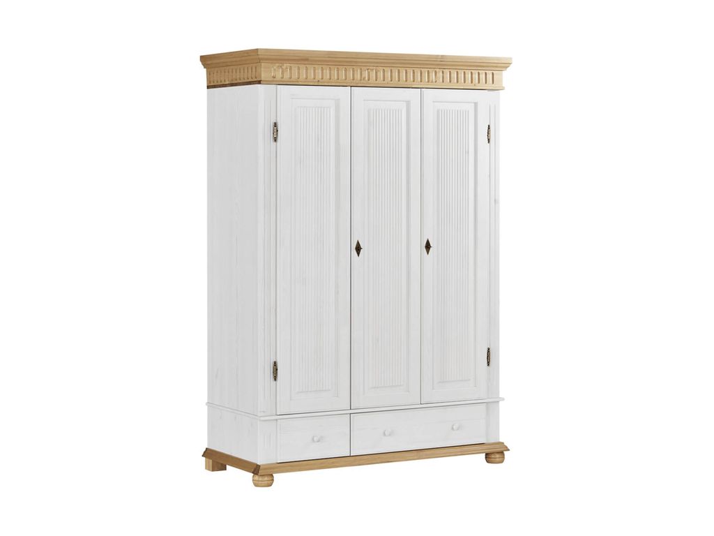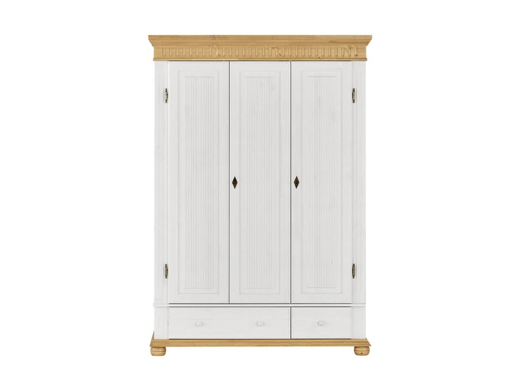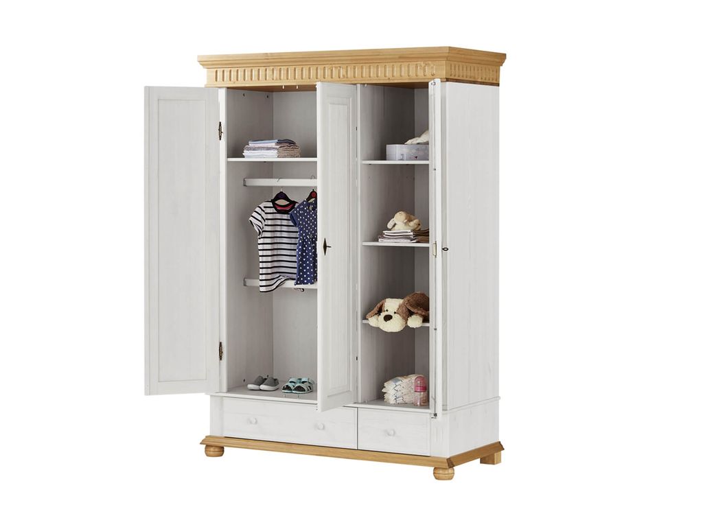 Описание: шкаф трехдверный из массива сосны предназначен для хранения предметов одежды. Оборудован двумя выдвижными ящиками, секцией с 2 штангами для одежды, вместительными полками, в том числе и для головных уборов. Это прочная и долговечная конструкция, которая обладает оригинальным и современным дизайном.