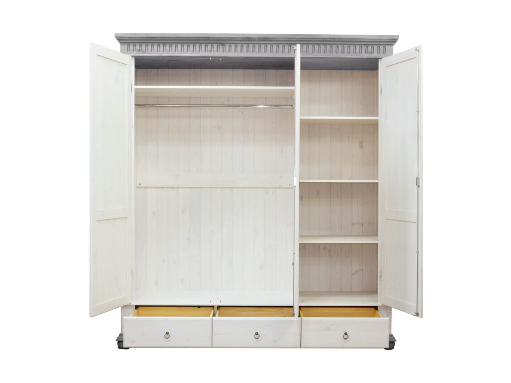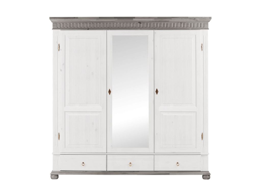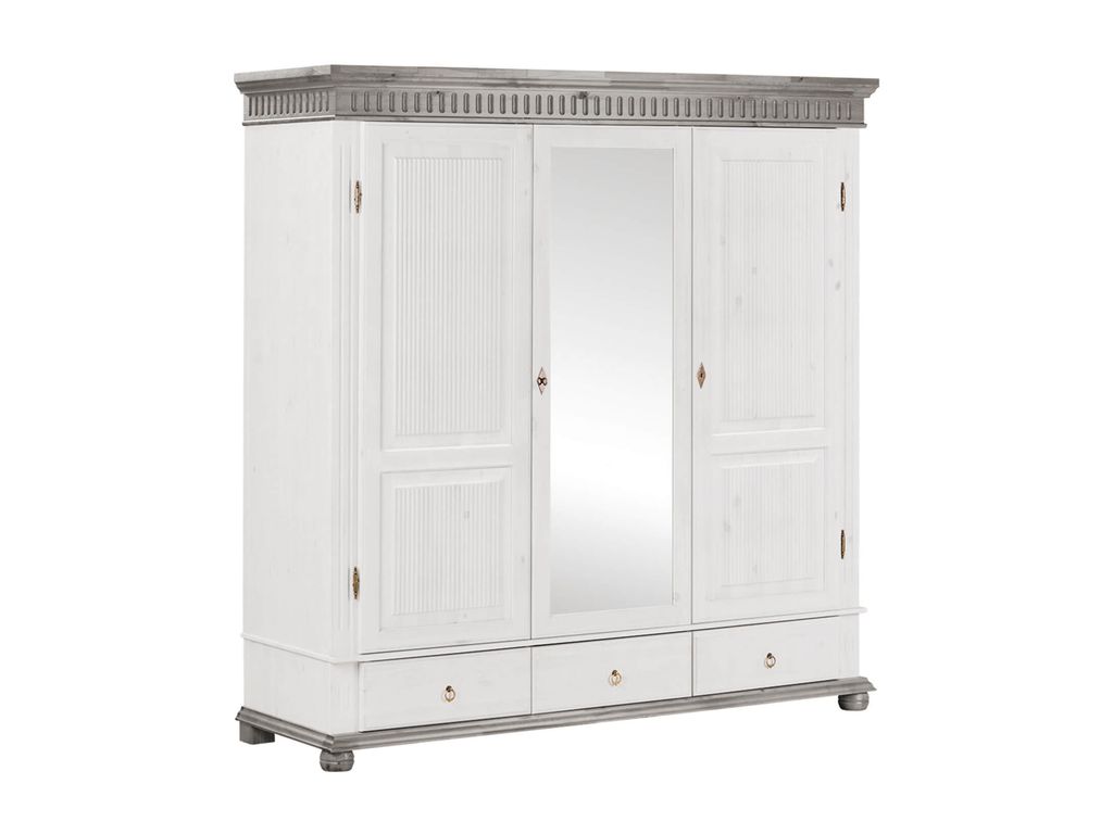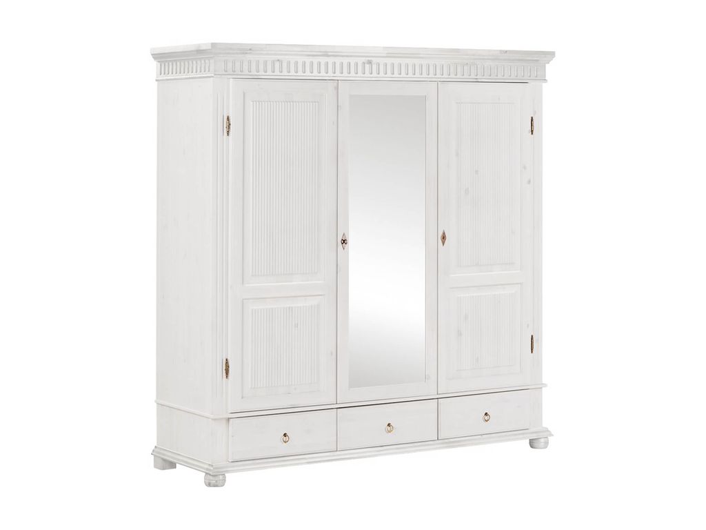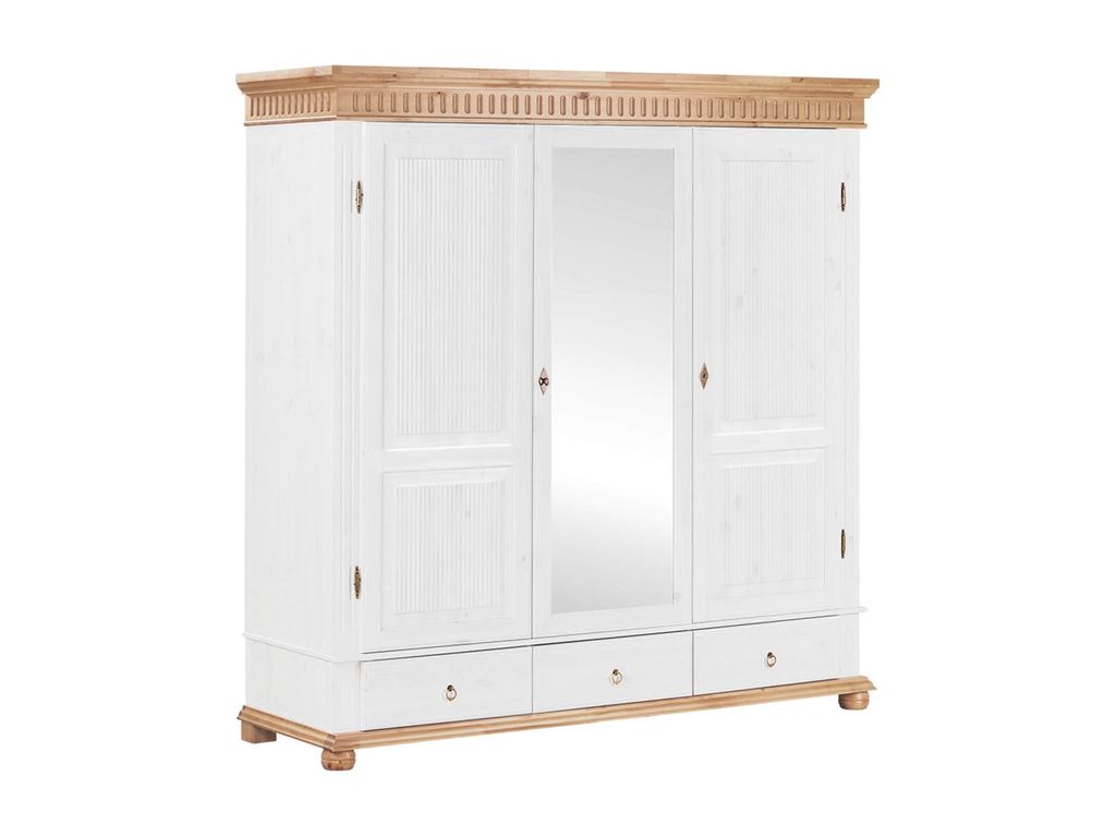 Описание: Трехдверный шкаф из массива сосны. Высота шкафа 218 см. Оснащен зеркалом, чтобы видеть себя в полный рост. Внутри - отделение со штангой, для головных уборов и 3 полки. Внизу расположены 3 выдвижных ящика. Двери закрываются на ключ.
