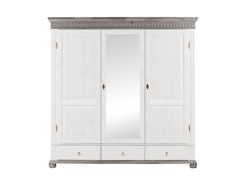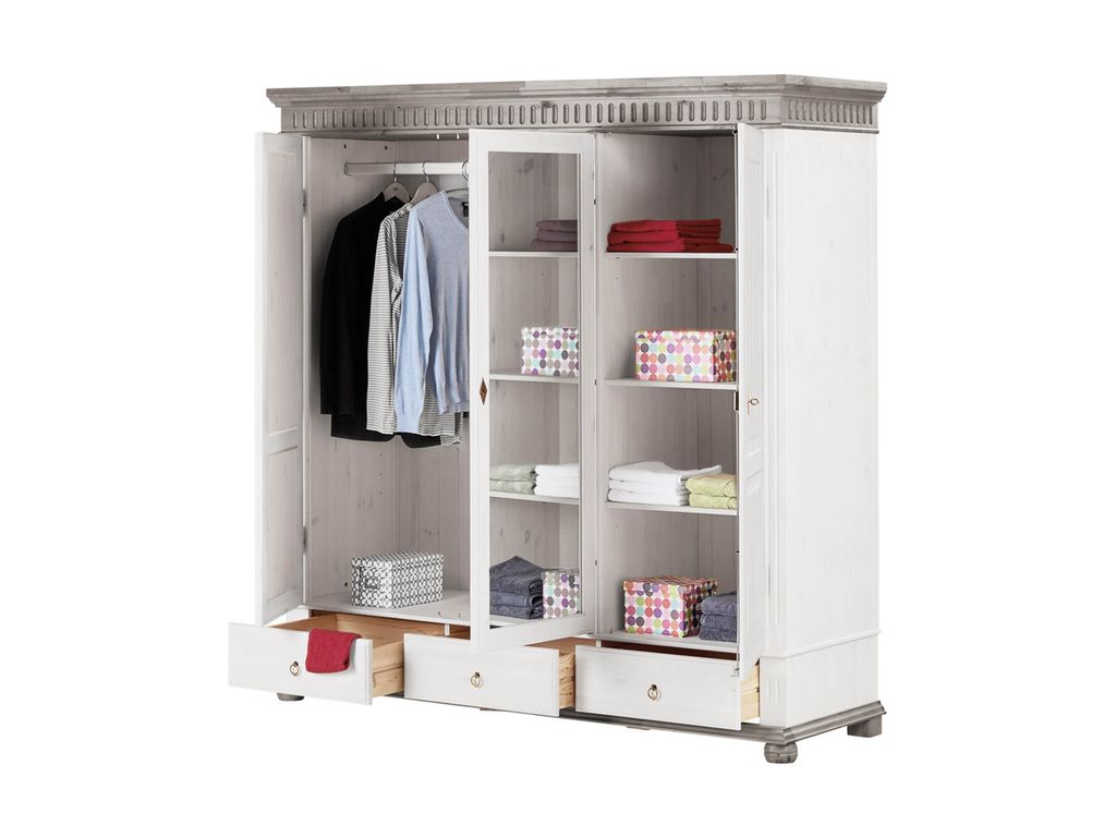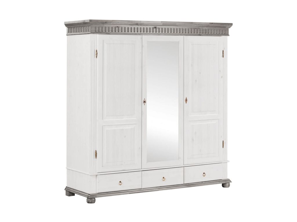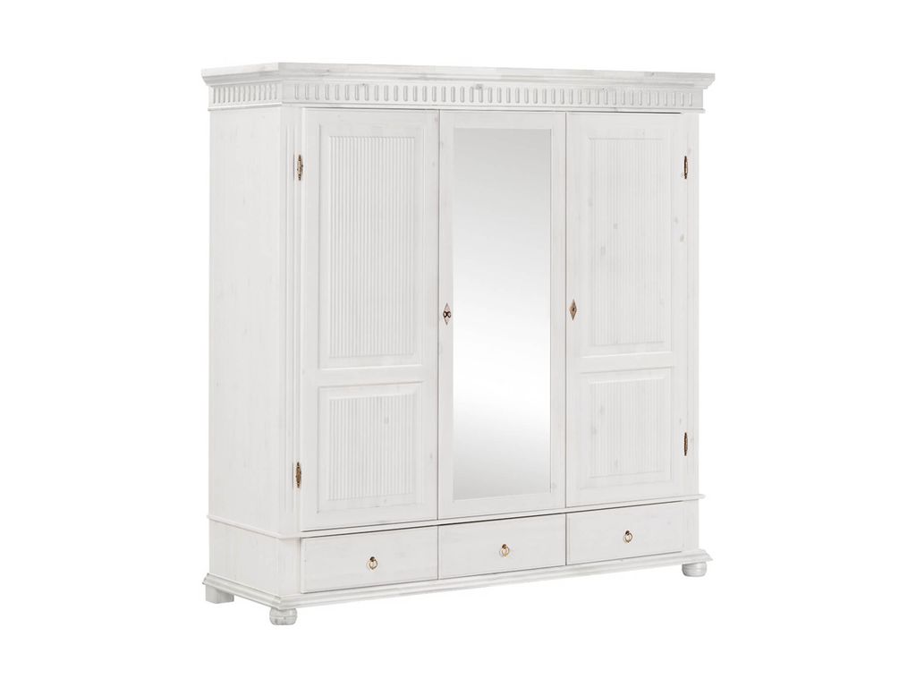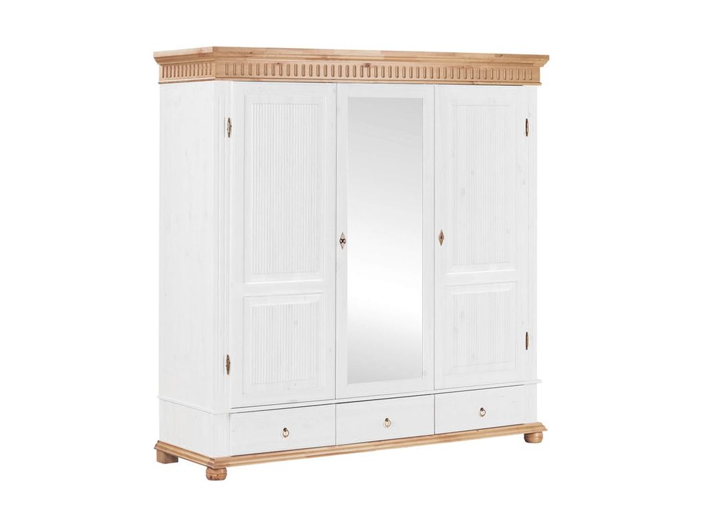 Описание: Трехдверный шкаф из массива сосны. Высота шкафа 199 см. Внутри имеется вместительное пространство для одежды со штангой и две секции с 4 полками каждая, а также три выдвижных ящика внизу. Дверь посередине оборудована зеркалом в полный рост. Все двери закрываются на ключ.