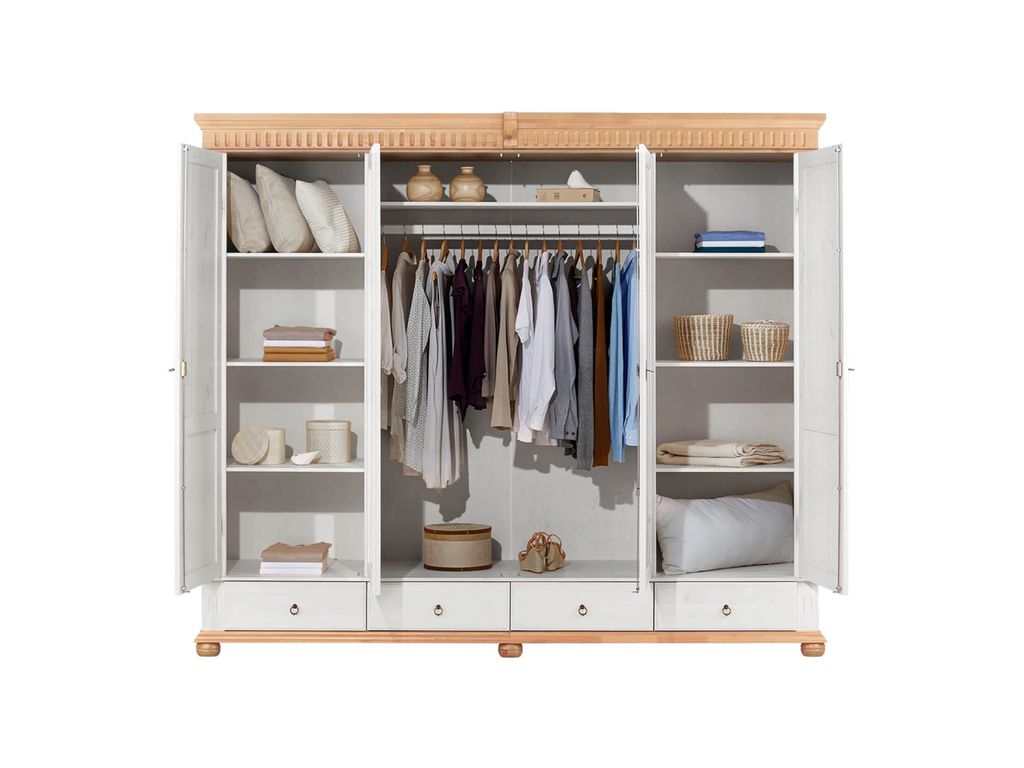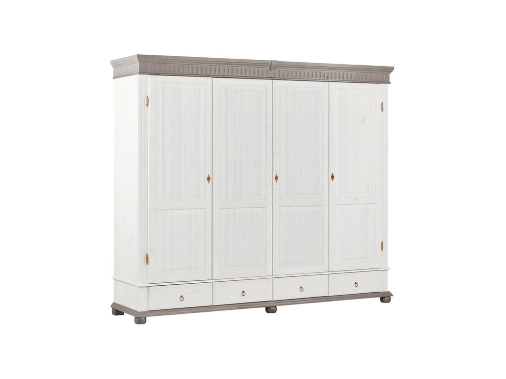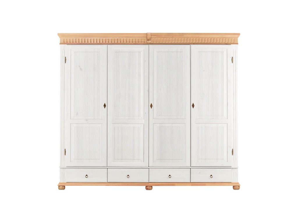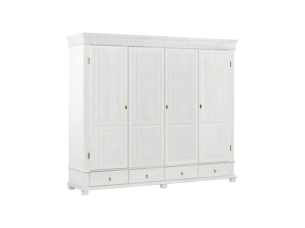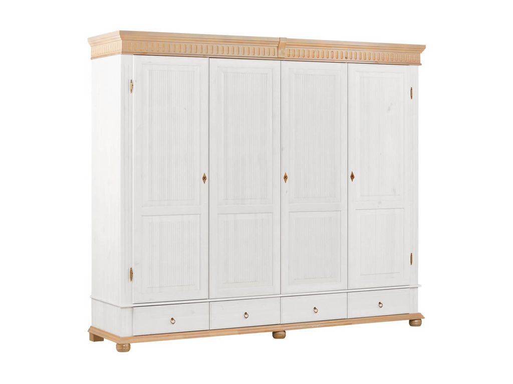 Описание: Четырехдверный шкаф из массива сосны. Высота шкафа 218 см. За четырьмя распашными дверями - 2 отделения на 4 полки каждая и место для хранения одежды со штангой. Вверху - пространство для головных уборов, снизу расположены 4 выдвижных ящика.