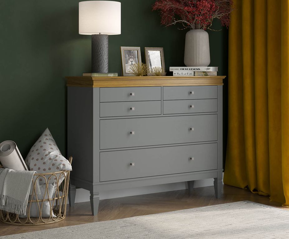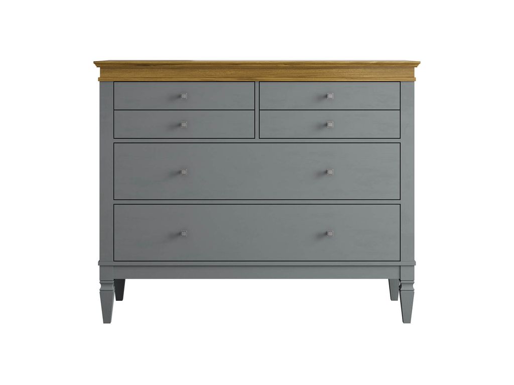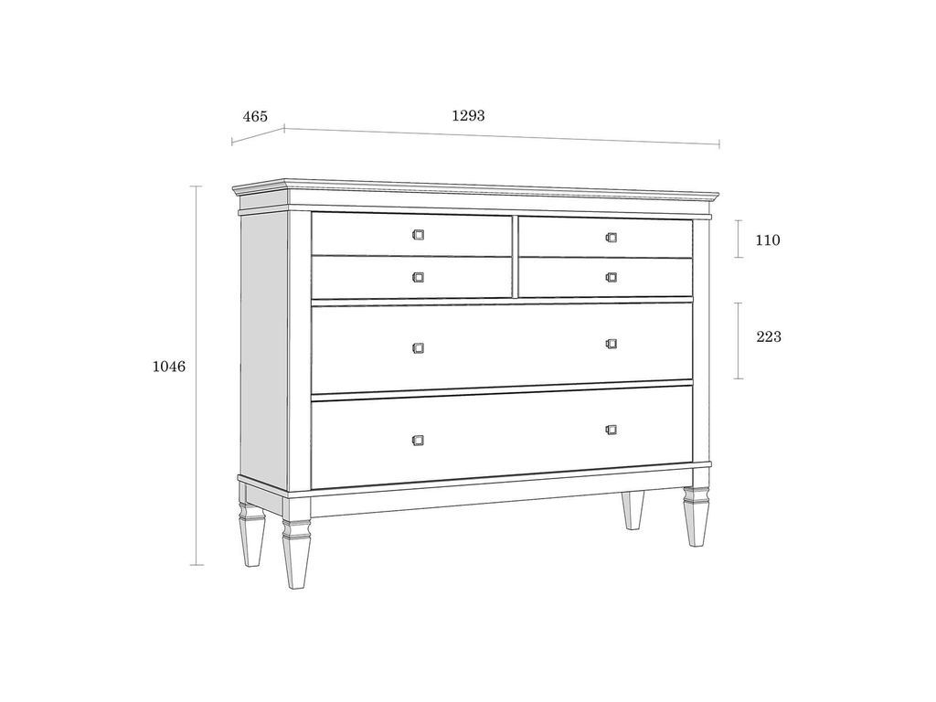 Описание: комод оснащен двумя широкими и четырьмя узкими ящиками. Высокие ножки обеспечивают оптимальный доступ при уборке.
