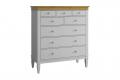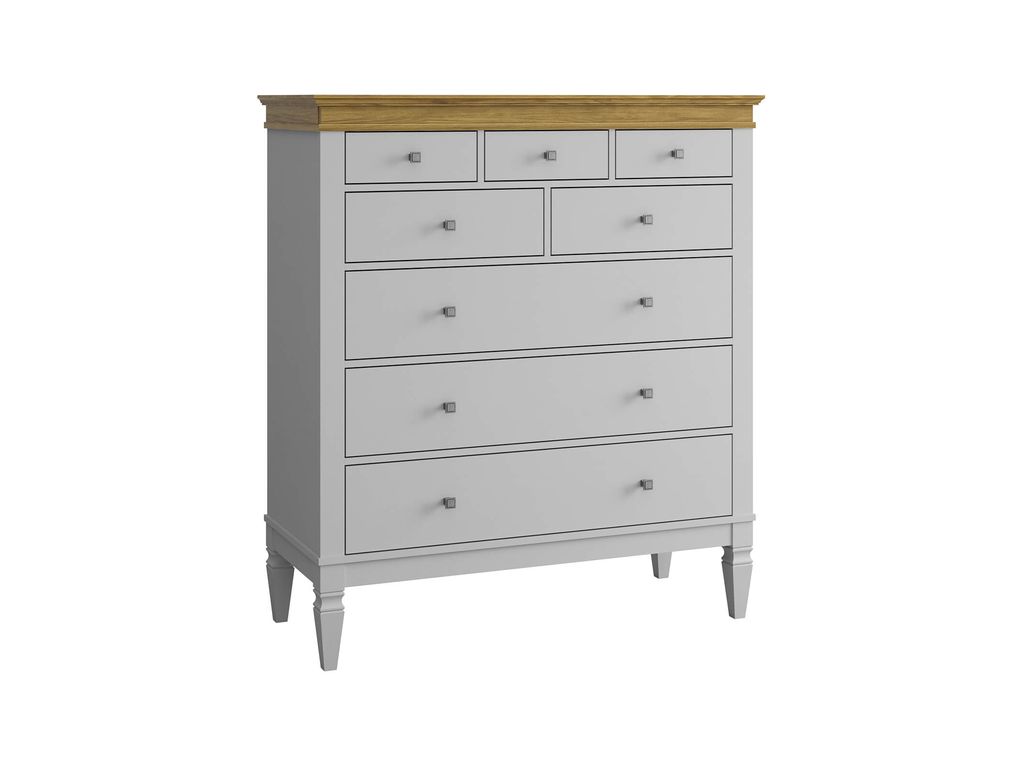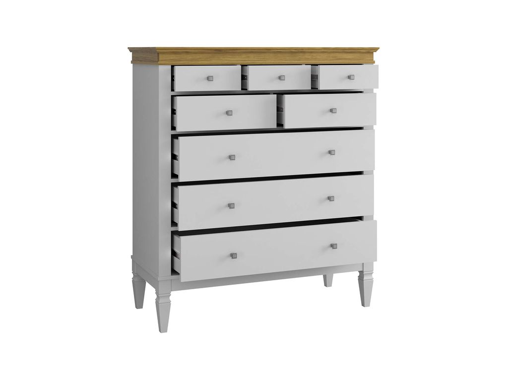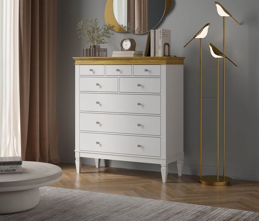 Описание: комод оснащен тремя широкими и пятью узкими ящиками. Высокие ножки обеспечивают оптимальный доступ при уборке.