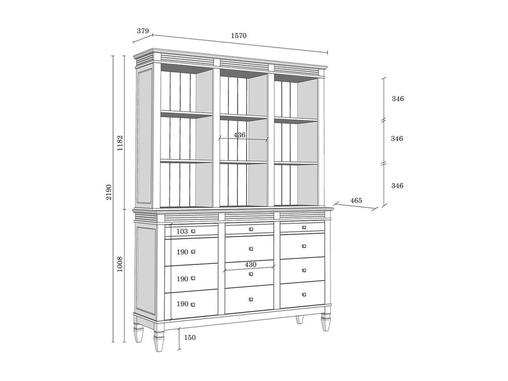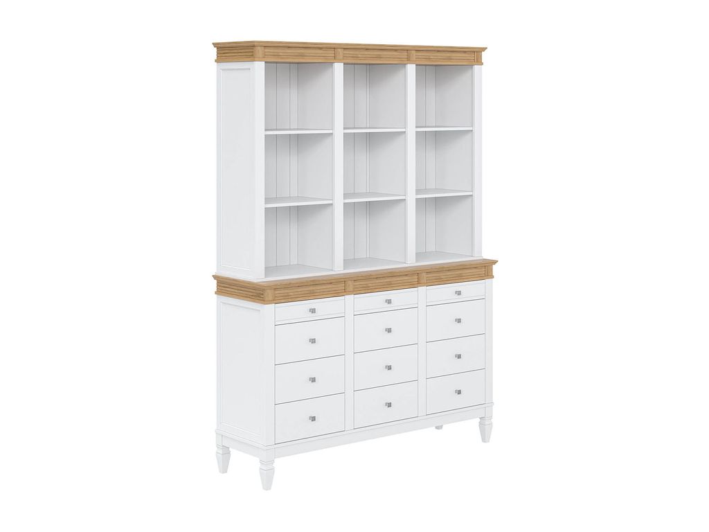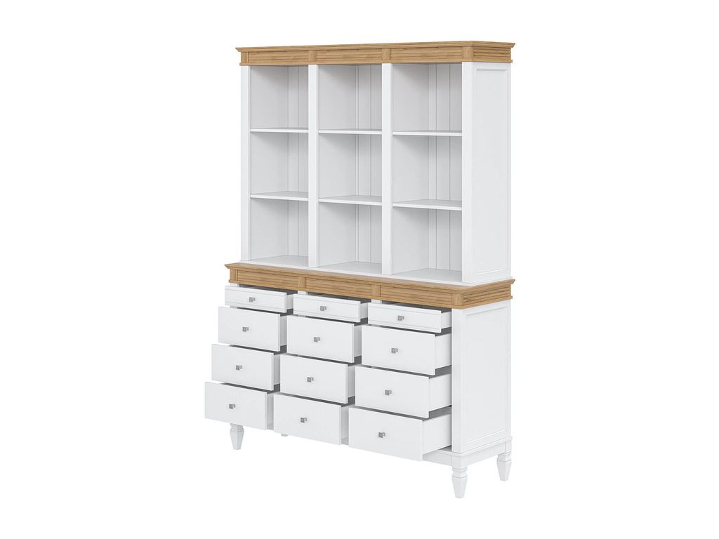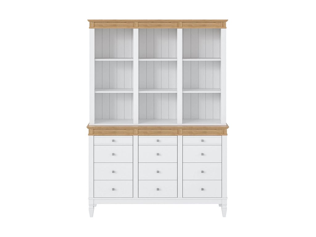 Описание: буфет выполнен из массива сосны. Удобный и вместительный, очень прост, но при этом функционален. Отлично впишется как в обеденную, так и в гостиную. Буфет визуально разделен на 3 секции которые укомплектованы шестью полками сверху и двенадцатью ящиками снизу.