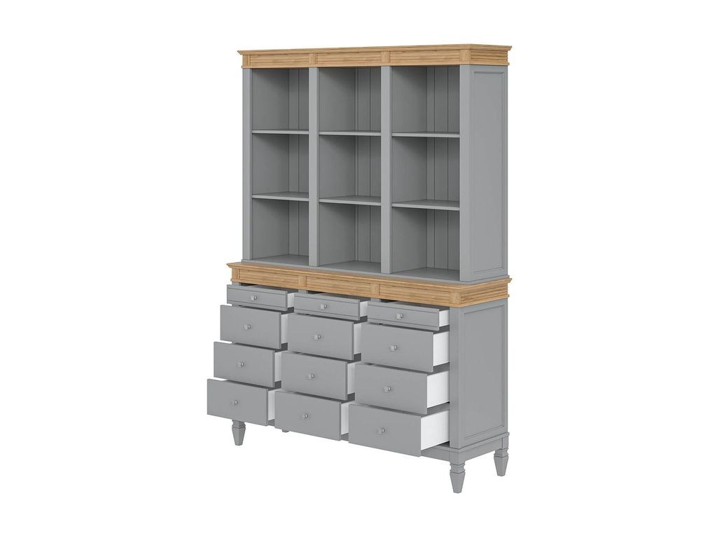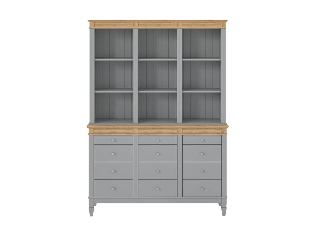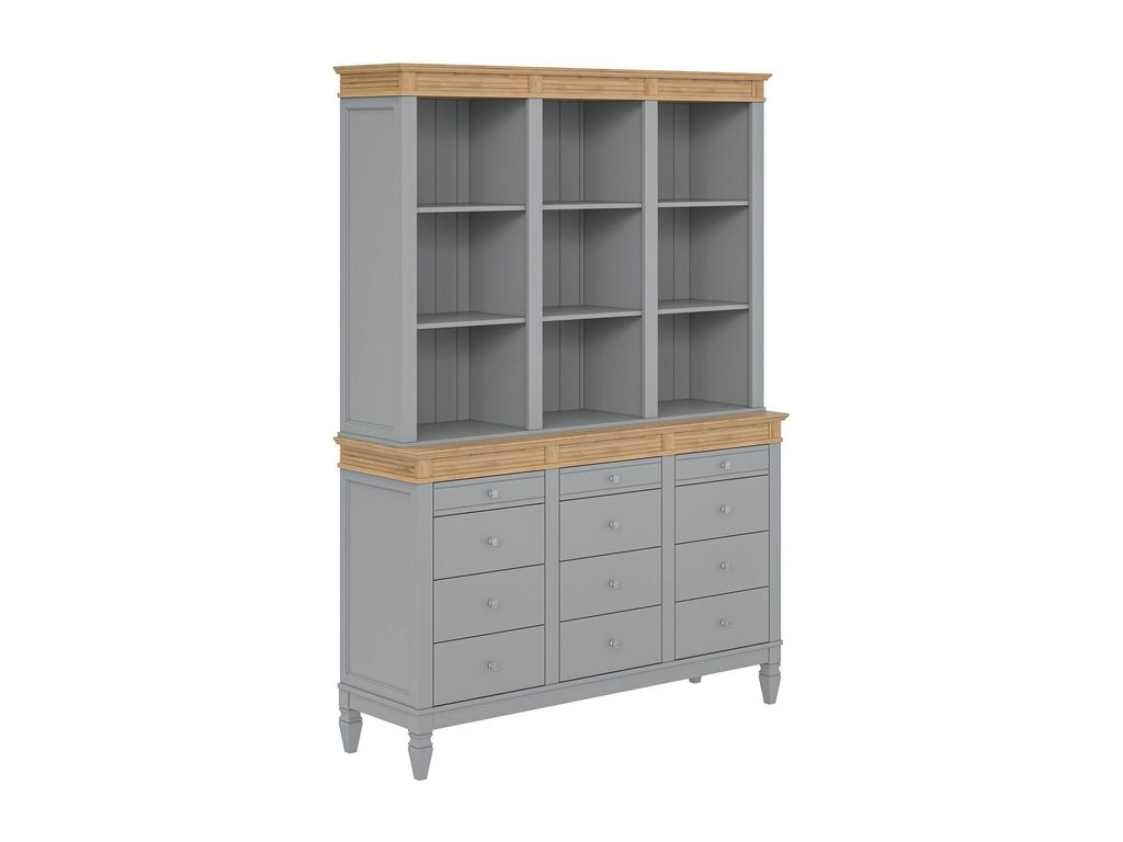 Описание: буфет выполнен из массива сосны. Удобный и вместительный, очень прост, но при этом функционален. Отлично впишется как в обеденную, так и в гостиную. Буфет визуально разделен на 3 секции которые укомплектованы шестью полками сверху и двенадцатью ящиками снизу.