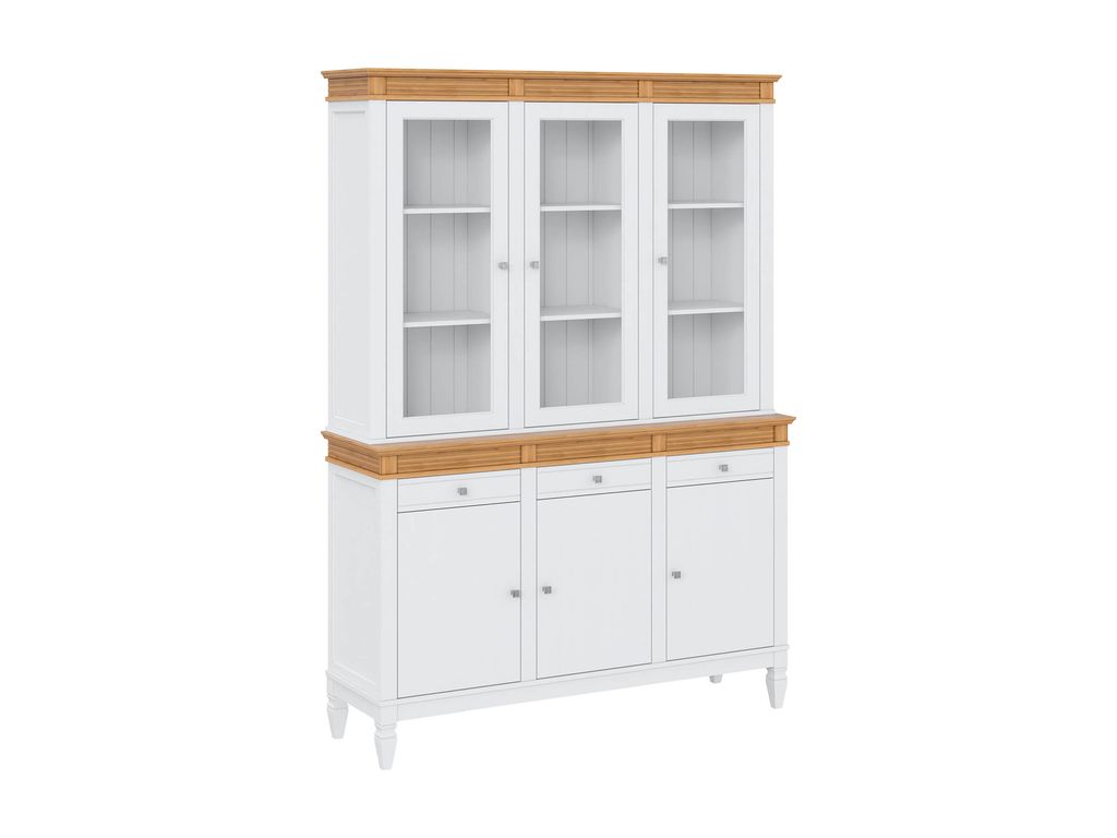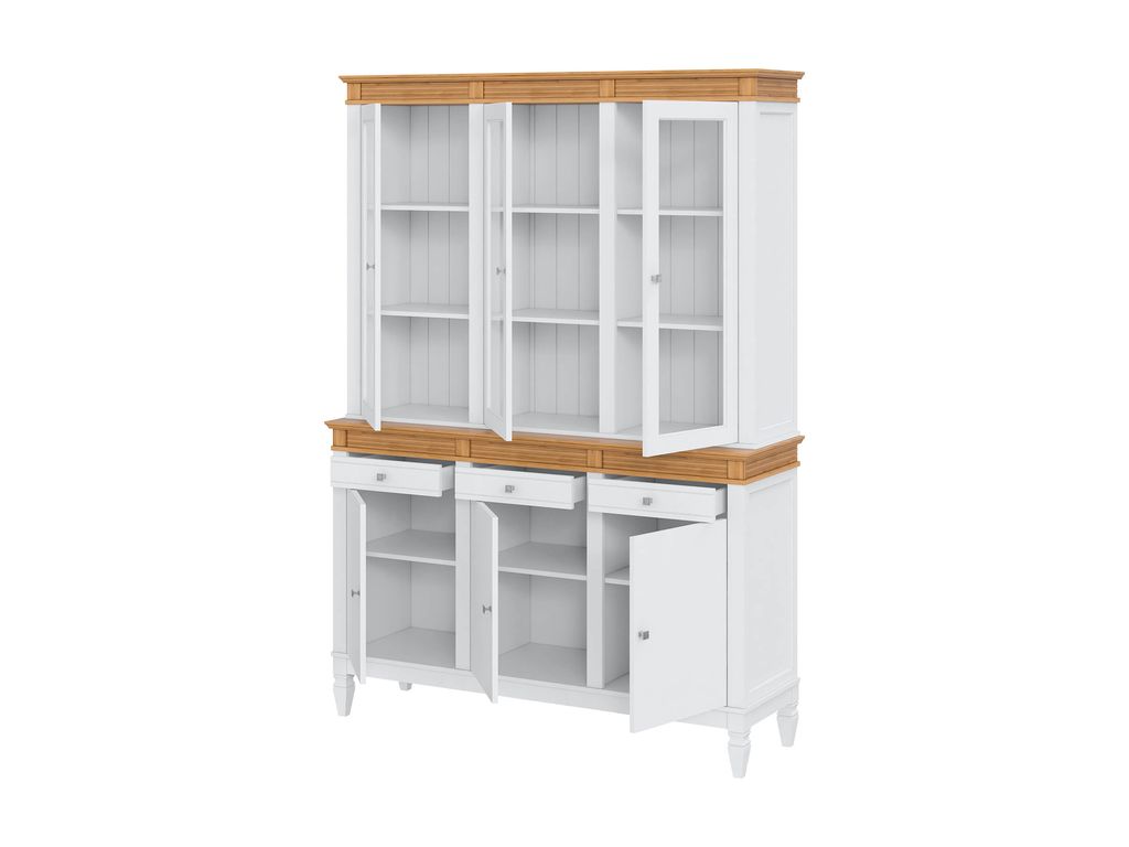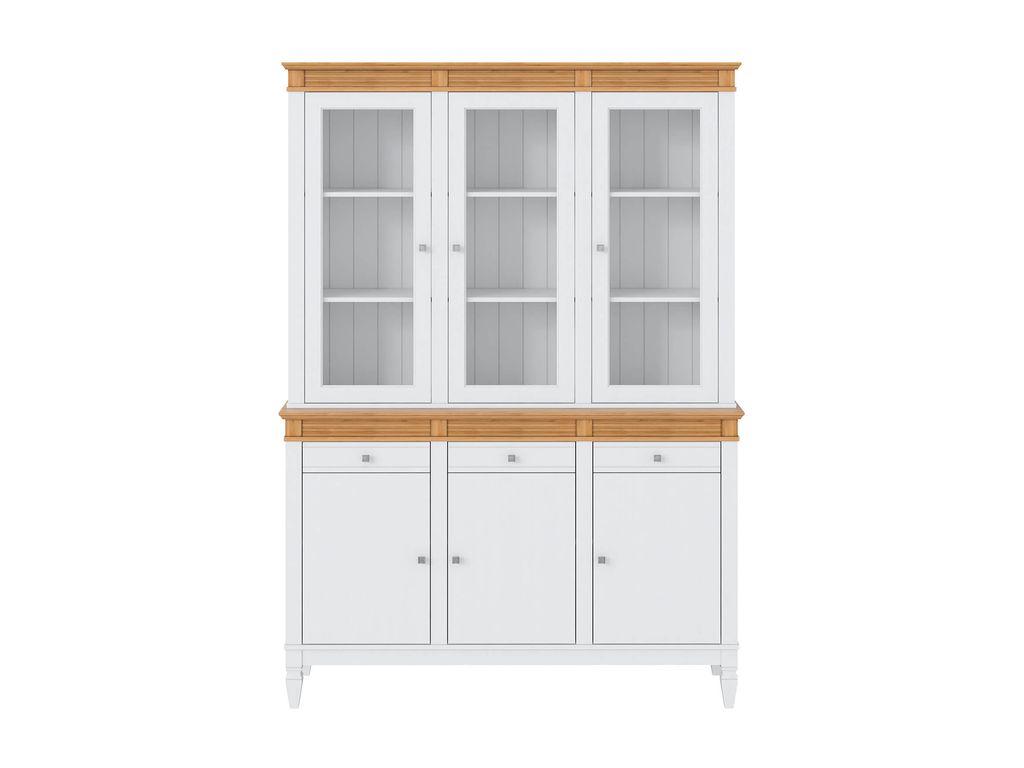 Описание: буфет выполнен из массива сосны. Удобный и вместительный, очень прост, но при этом функционален. Отлично впишется как в обеденную, так и в гостиную. Буфет визуально разделен на 3 секции которые укомплектованы шестью полками сверху за тремя стеклянными дверями, тремя полками снизу за тремя распашными дверями и тремя ящиками.