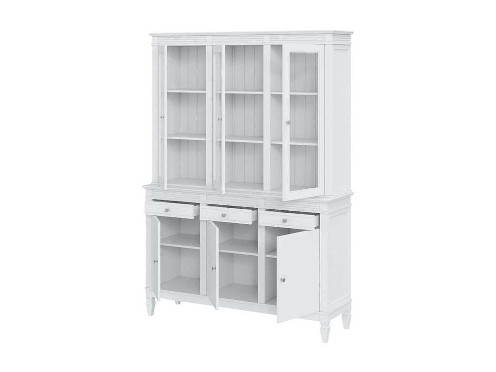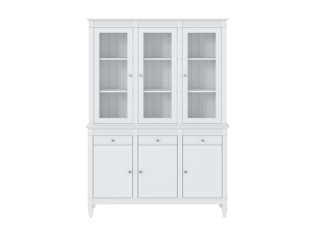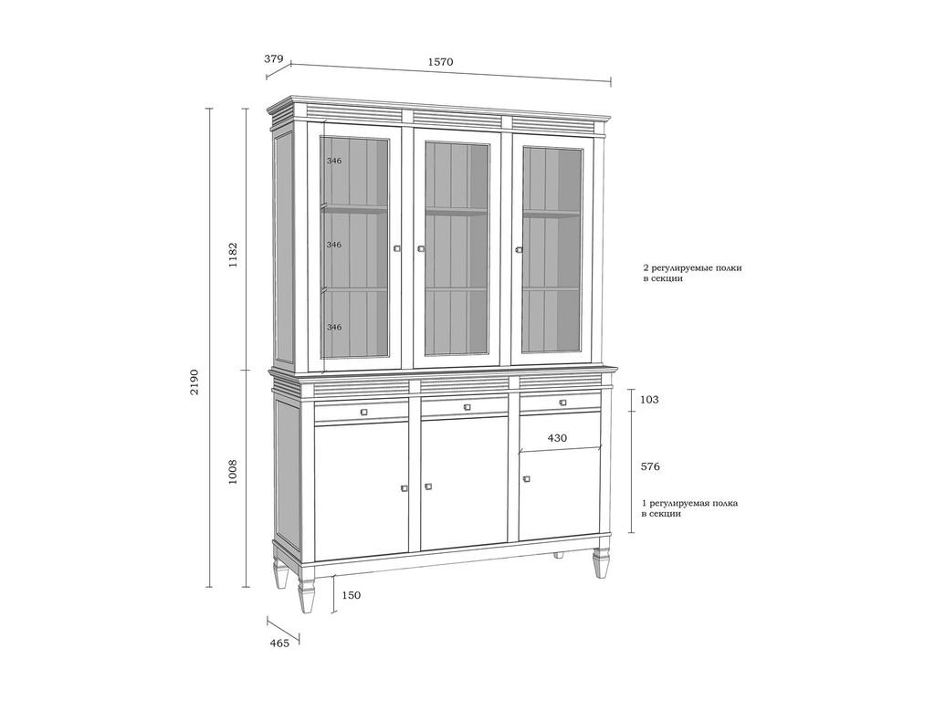 Описание: буфет выполнен из массива сосны. Удобный и вместительный, очень прост, но при этом функционален. Отлично впишется как в обеденную, так и в гостиную. Буфет визуально разделен на 3 секции которые укомплектованы шестью полками сверху за тремя стеклянными дверями, тремя полками снизу за тремя распашными дверями и тремя ящиками.