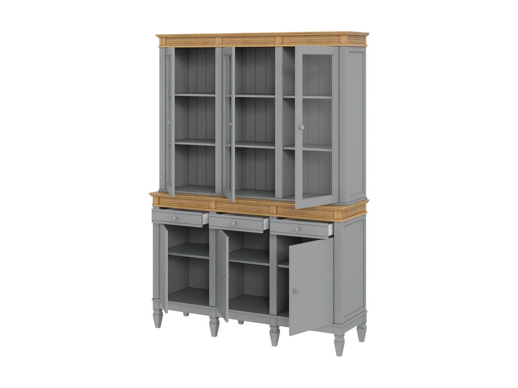 Описание: буфет выполнен из массива сосны. Удобный и вместительный, очень прост, но при этом функционален. Отлично впишется как в обеденную, так и в гостиную. Буфет визуально разделен на 3 секции которые укомплектованы шестью полками сверху за тремя стеклянными дверями, тремя полками снизу за тремя распашными дверями и тремя ящиками.