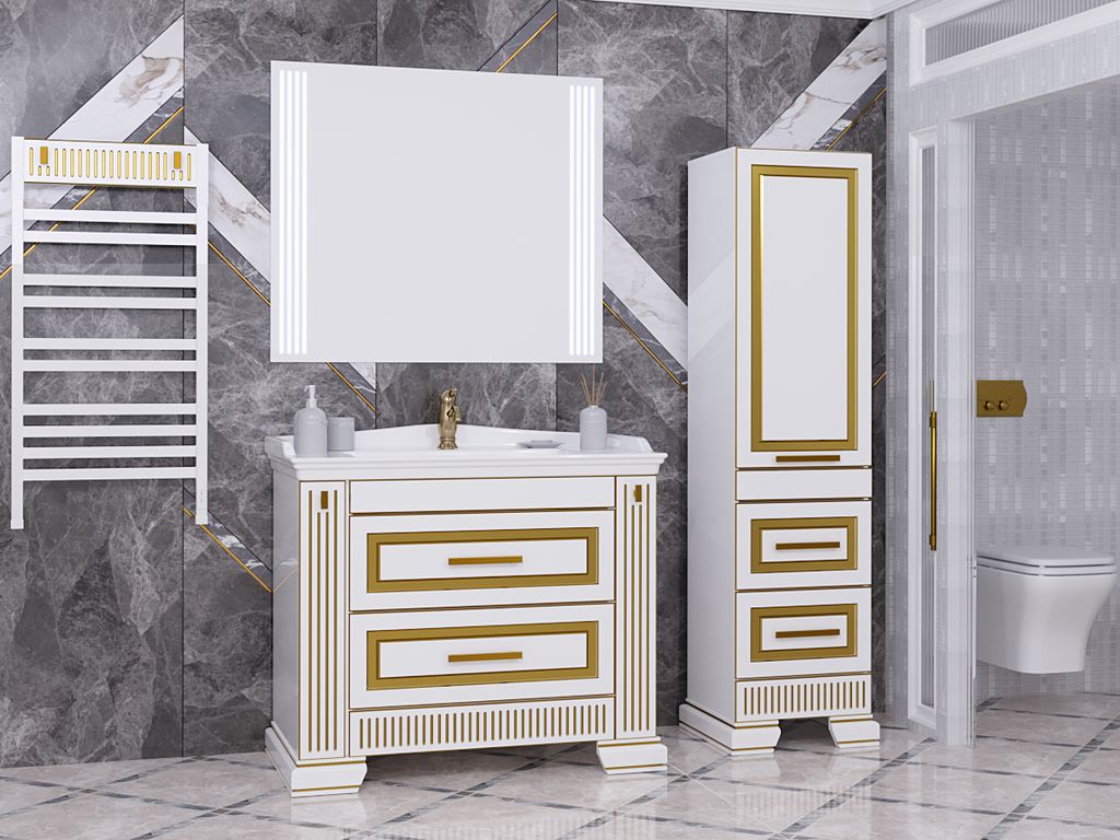 Современная и шикарная мебель для ванной комнаты ОНИКС изготавливается из высококачественного МДФ с глянцевым покрытием и декорируется золотой и серебристой патиной.
