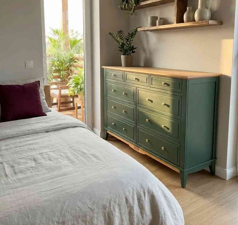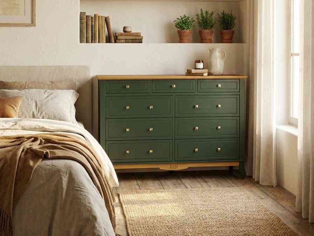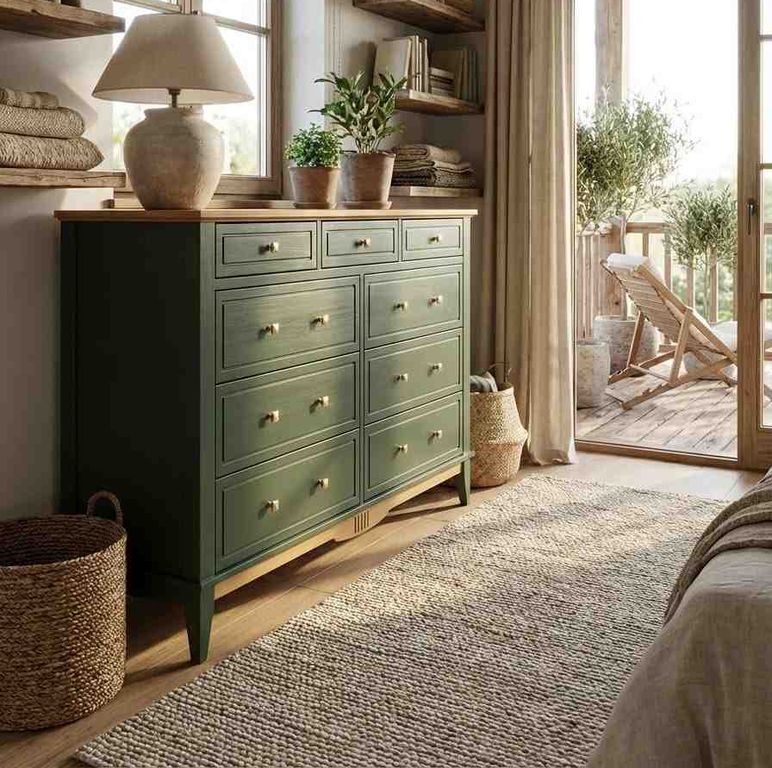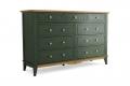 Направляющие скрытого монтажа с доводчиками. Ручки-кнопки прямоугольной формы с четкими гранями и выступающей пирамидальной центральной частью, цвет – латунь. Донья ящиков сделаны из оргалита светло – коричневого древесного цвета, стенки ящиков окрашены в цвет корпуса.