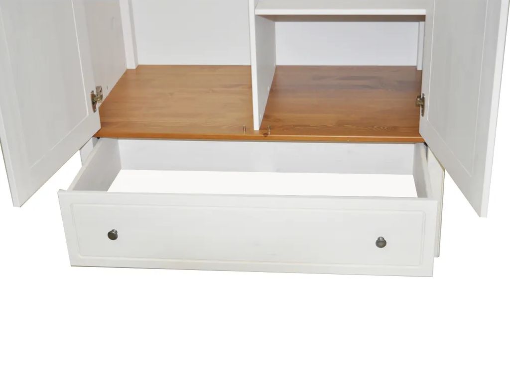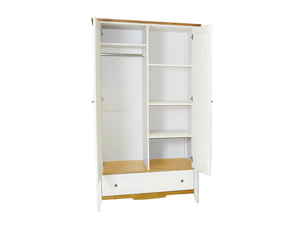 Направляющие шариковые частичного выдвижения, без доводчиков. Петли с доводчиками Hettich. Металлическая ручка-кнопка. Дно ящиков - ХДФ белого цвета. Внутренняя часть ящиков - в цвет изделия. Наполнение: полки и штанга, внизу вместительный ящик.