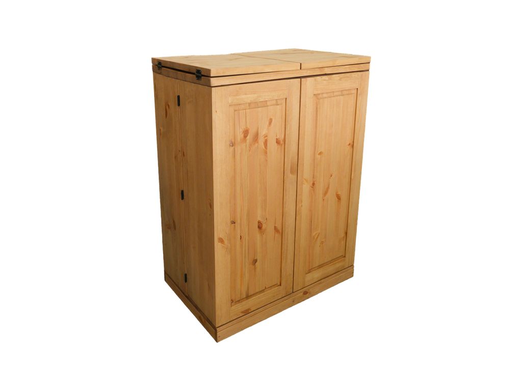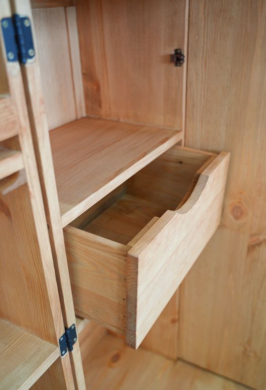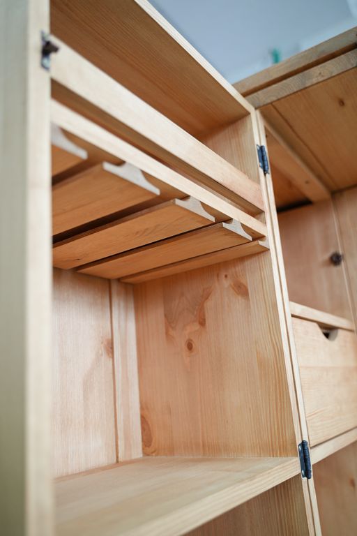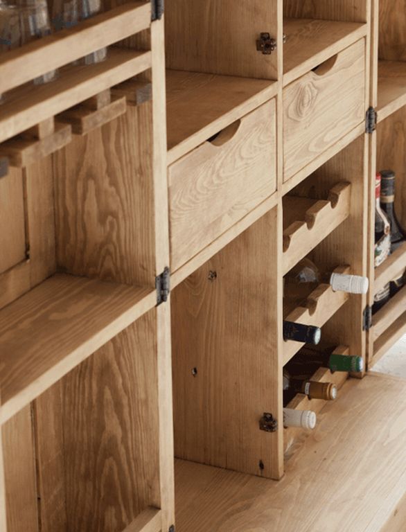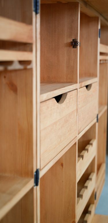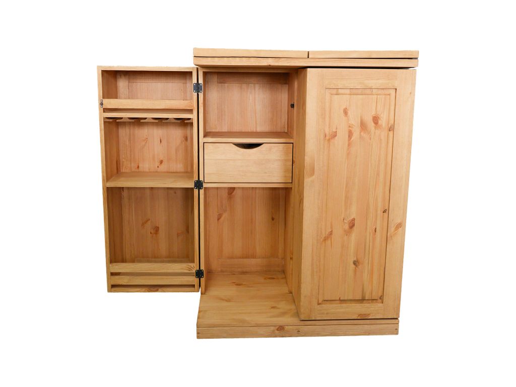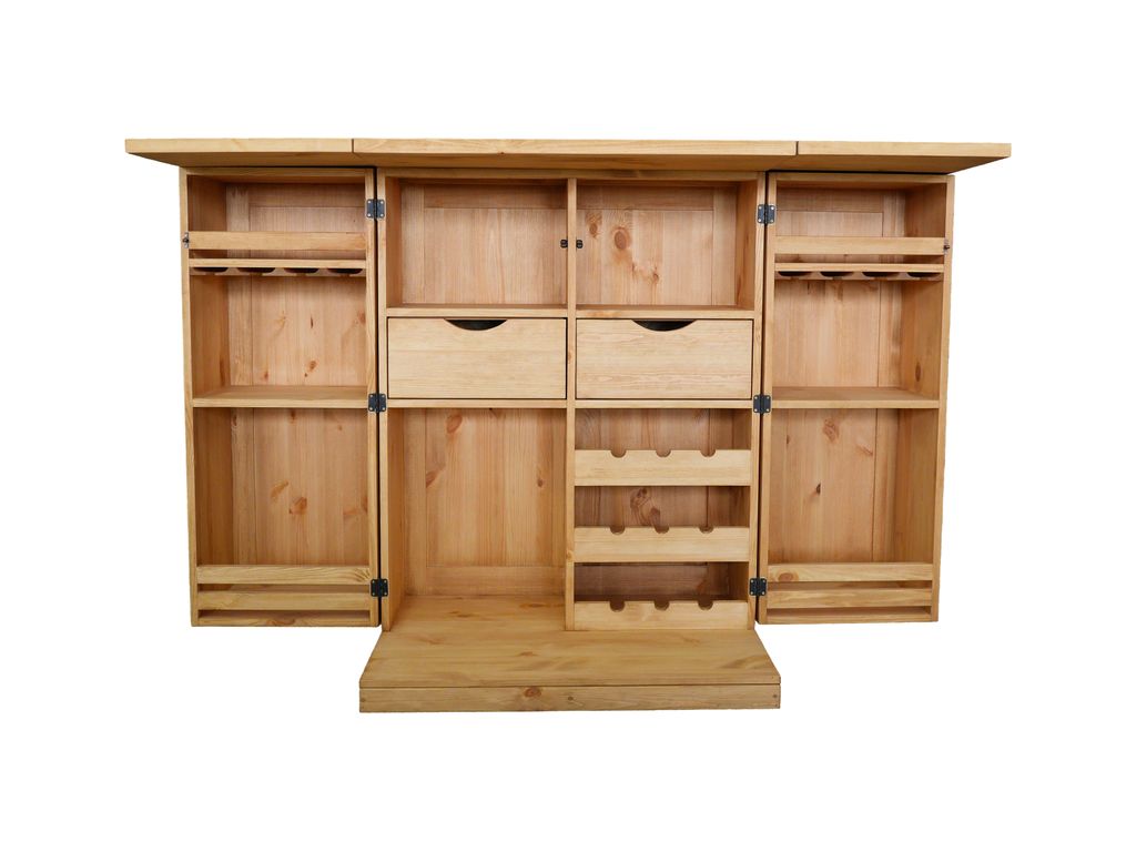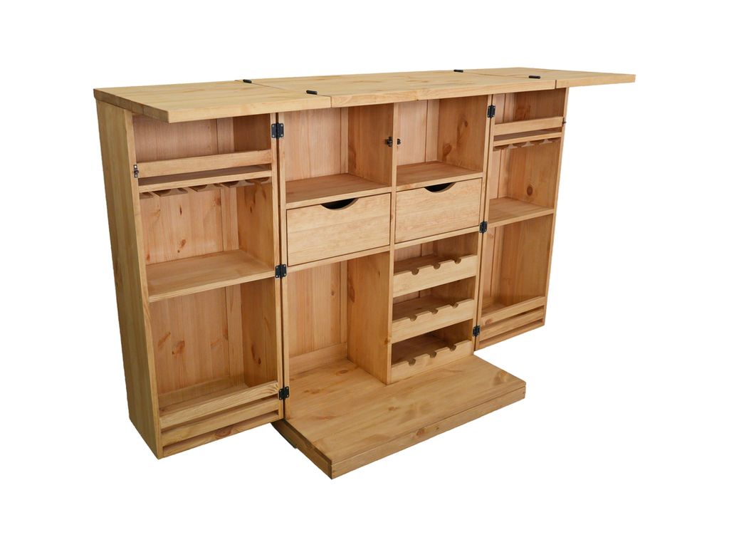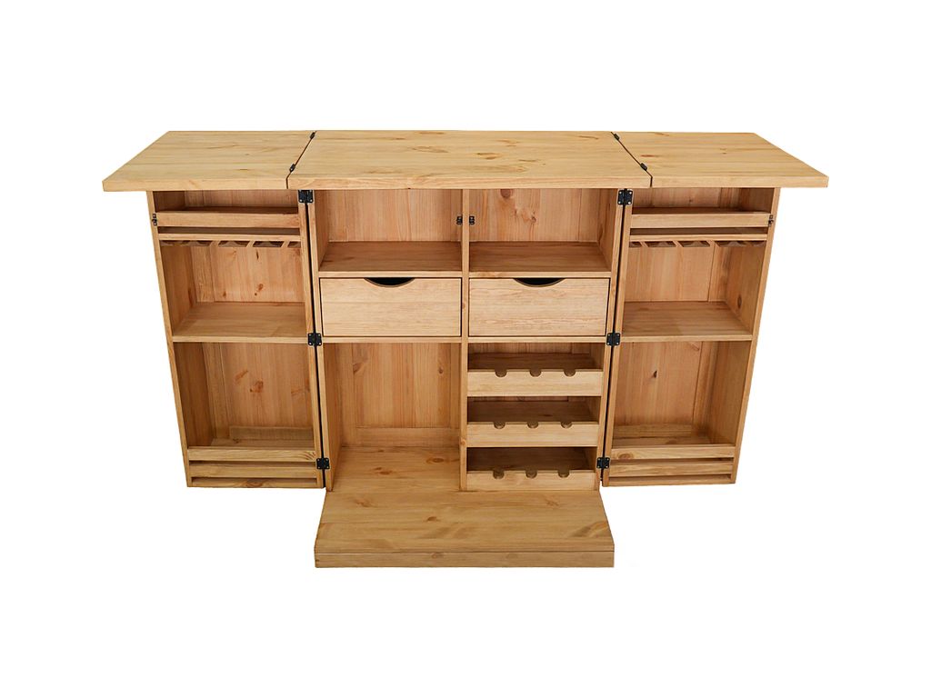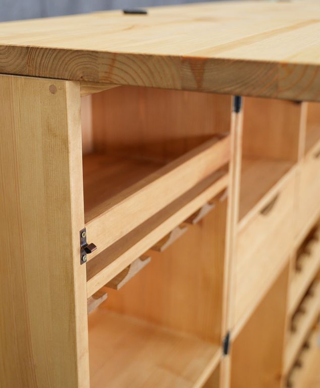 При открытых дверях крылья столешницы раскладываются и получается широкая барная стойка длиной 169 см. Торцевые части столешницы и крыльев укреплены поперечными вставками. В верхней части сделаны приспособления (kit-бары) для рюмок и бокалов.