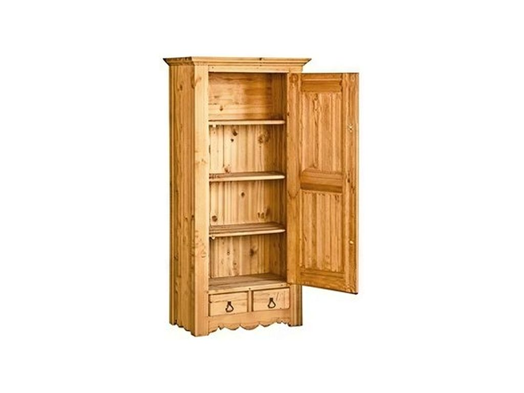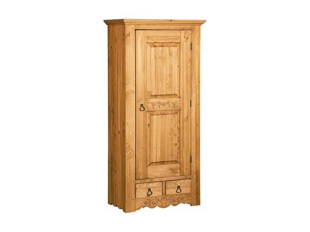 Два выдвижных ящика в нижней части шкафа. Ручная резьба на двери и цоколе. Филенчатые двери. Задняя стенка шкафа сделана из массива сосны.
