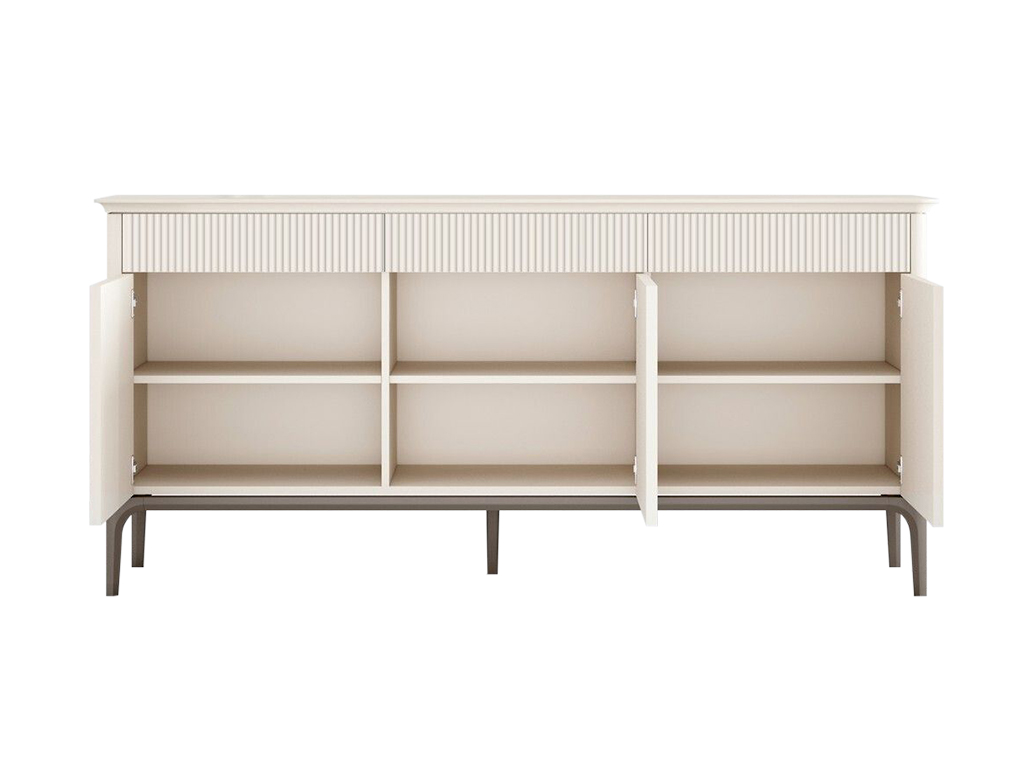 Верхняя часть окрашена в цвет светлый беж (K07 - ближайший RAL 9001), низ золотая патина. Фасады и дверцы имеют систему открывания TIP-ON, открывание дверей и ящиков простым нажатием на фасад.