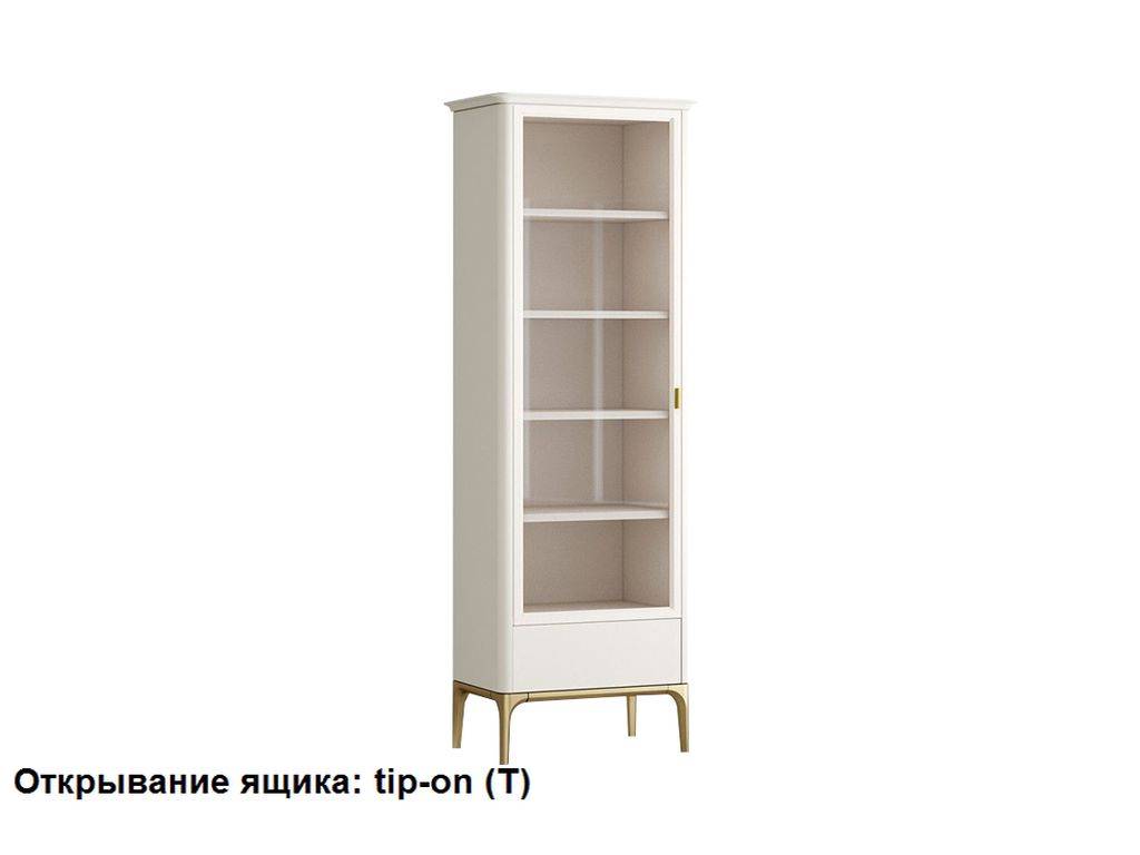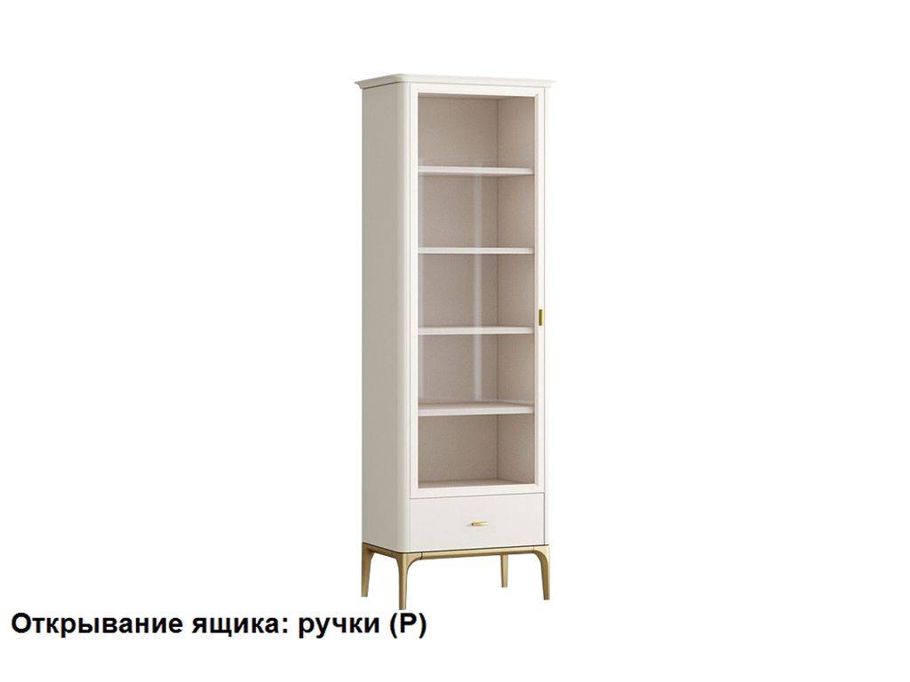 С левым открыванием двери. Верхняя часть витрины окрашена в цвет светлый беж (K07 - ближайший RAL 9001), низ золотая патина. Имеется опция способа открывания ящиков: с помощью ручки (направляющие с доведением) или нажатием на фасад (tip-on).