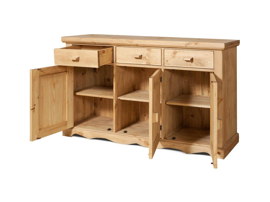 За каждой дверкой полка. Три выдвижных ящика на деревянных полозьях.