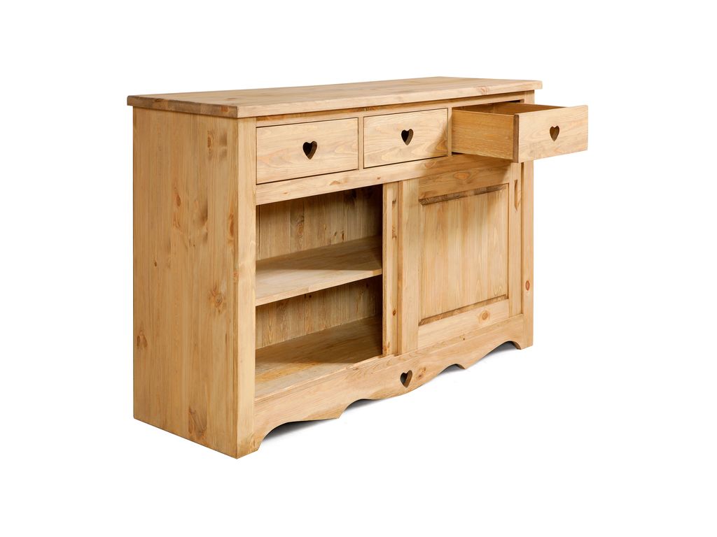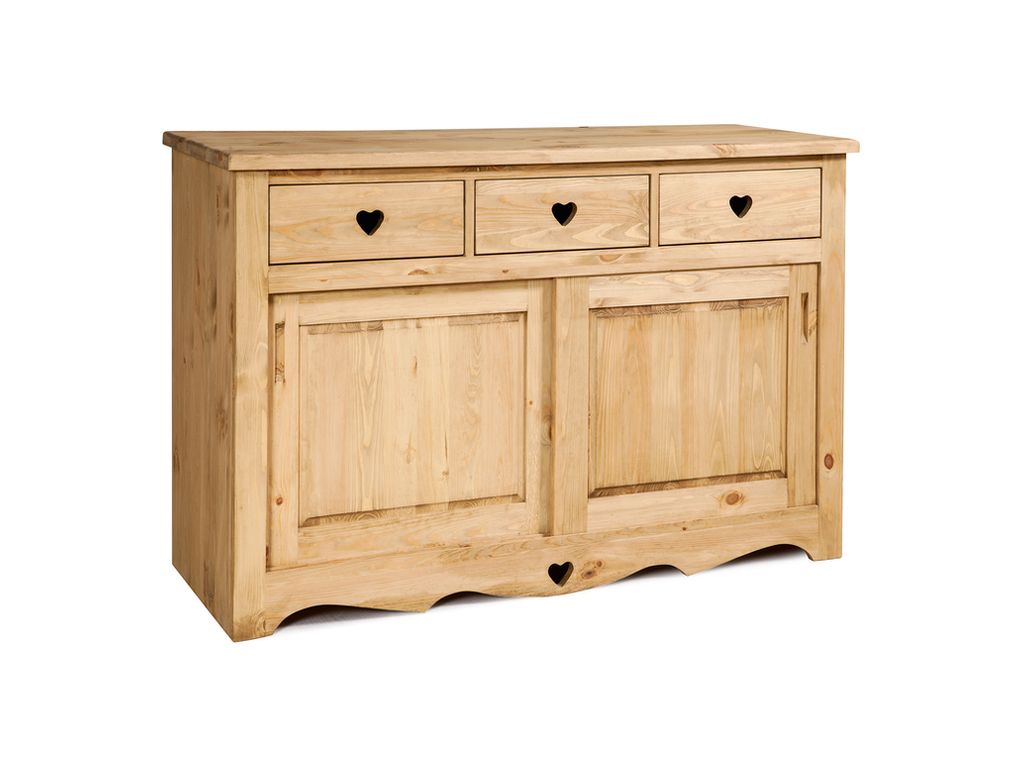 Две раздвижные дверки, сплошная полка. Три выдвижных ящика на деревянных полозьях.