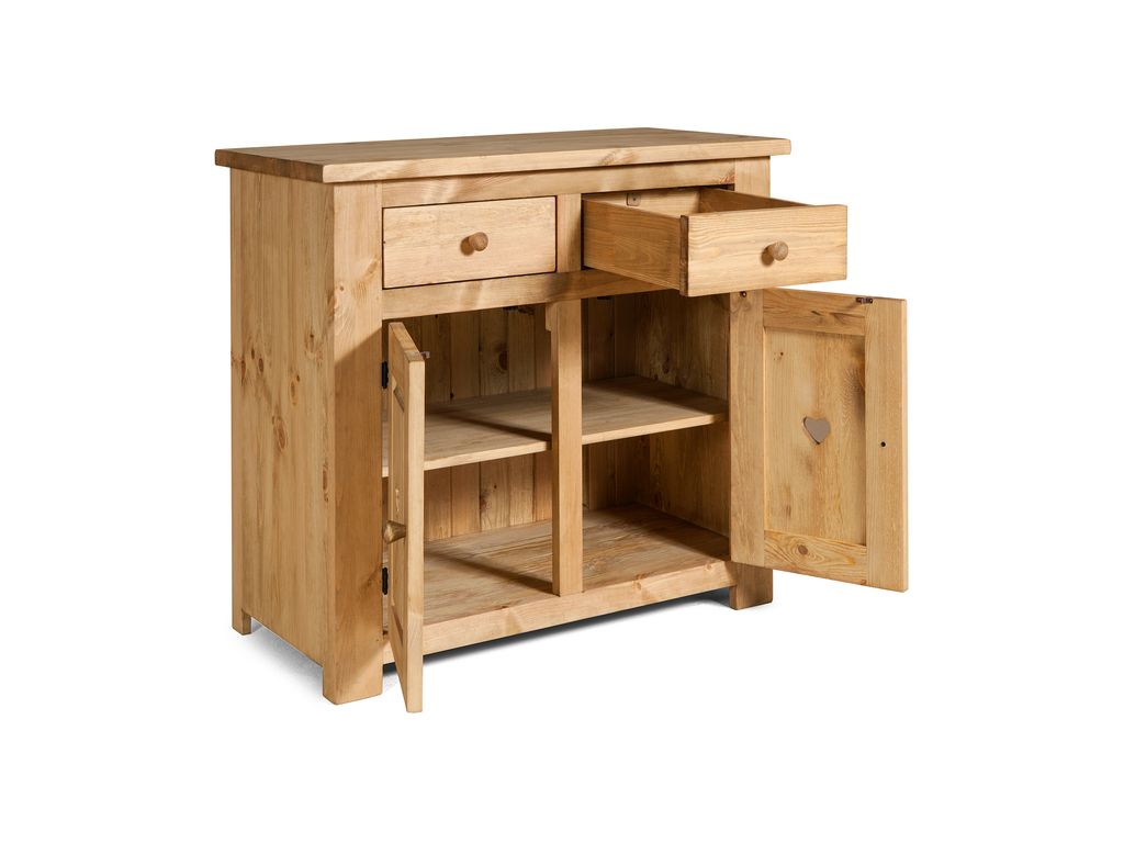 за двумя распашными дверками одна сплошная полка. Два выдвижных ящичка без направляющих на деревянных полозьях.