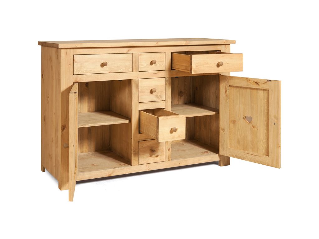 За каждой дверкой одна навесная полка. Четыре выдвижных ящика поменьше, два выдвижных ящика большего размера. Ящики без направляющих, на деревянных полозьях.