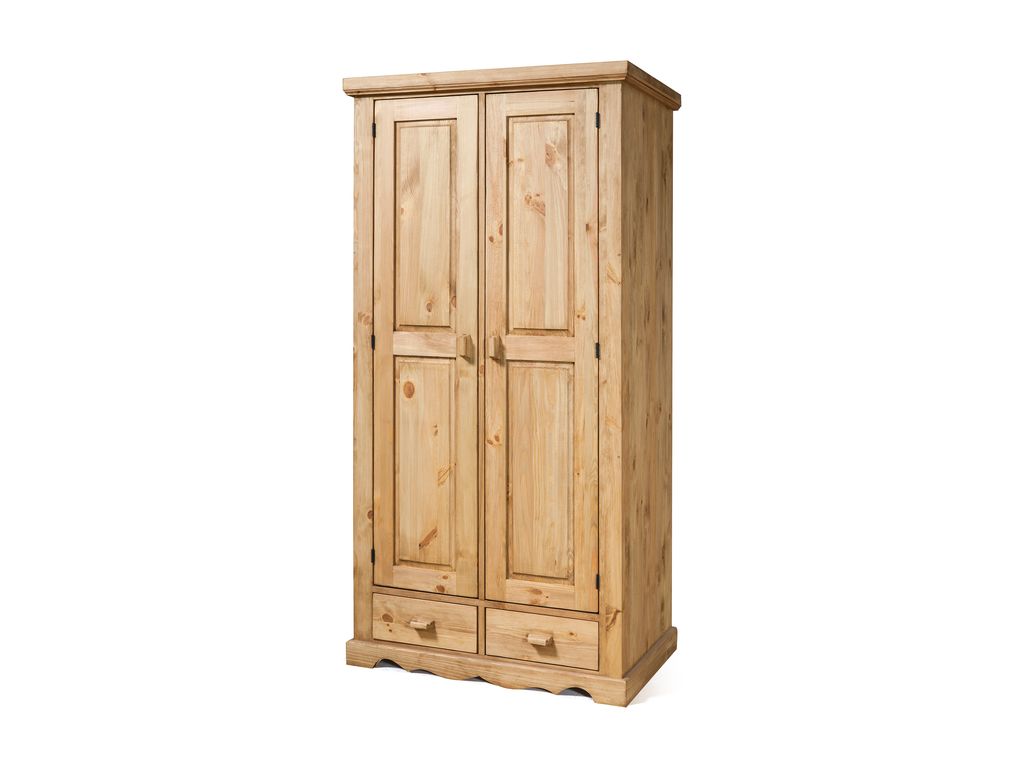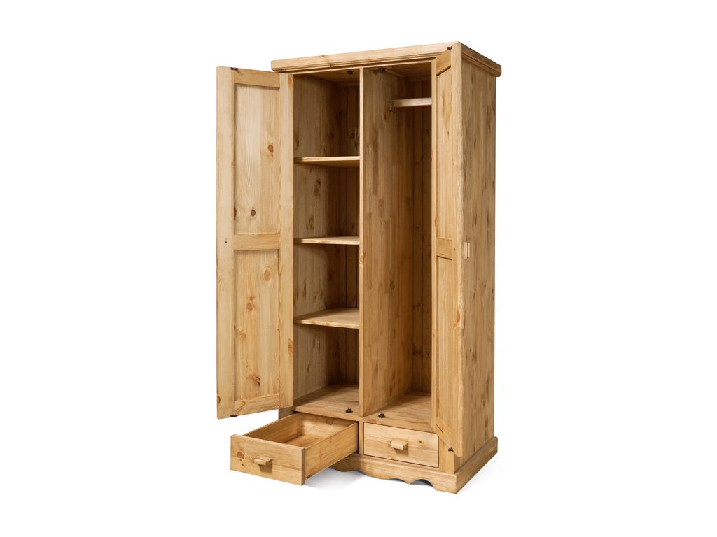 Наполнение: за дверкой слева — 3 полки, за дверкой справа — съёмная штанга. Два выдвижных ящика (без направляющих, на деревянных полозьях)
