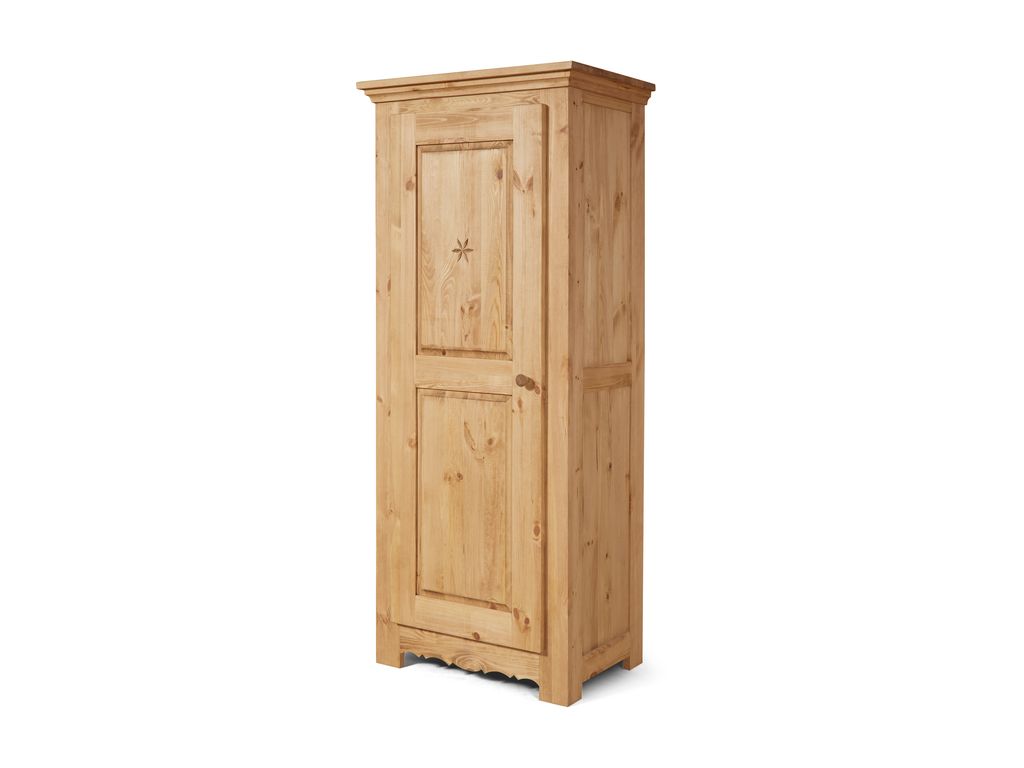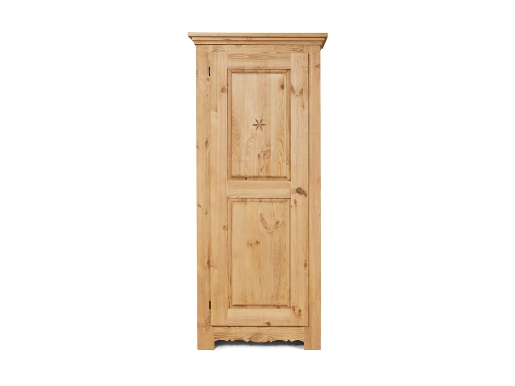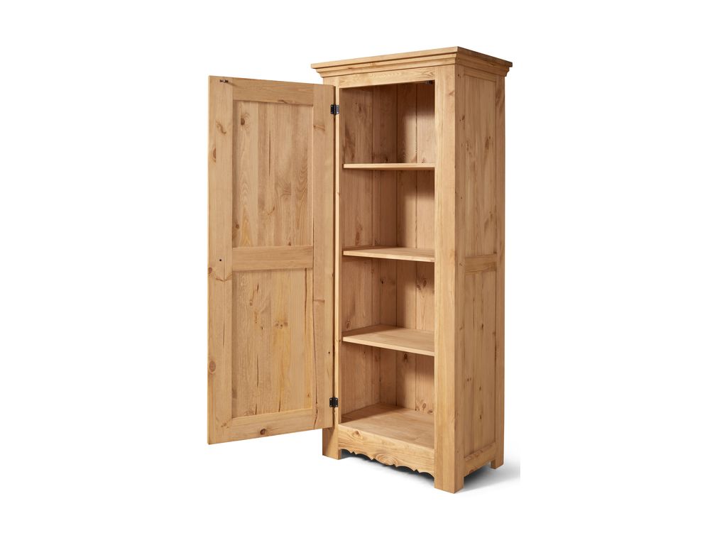 На двери резной узор. 3 съёмные полки, расстояние между полками 345 мм, резной цоколь. Ручка деревянная 1 шт.