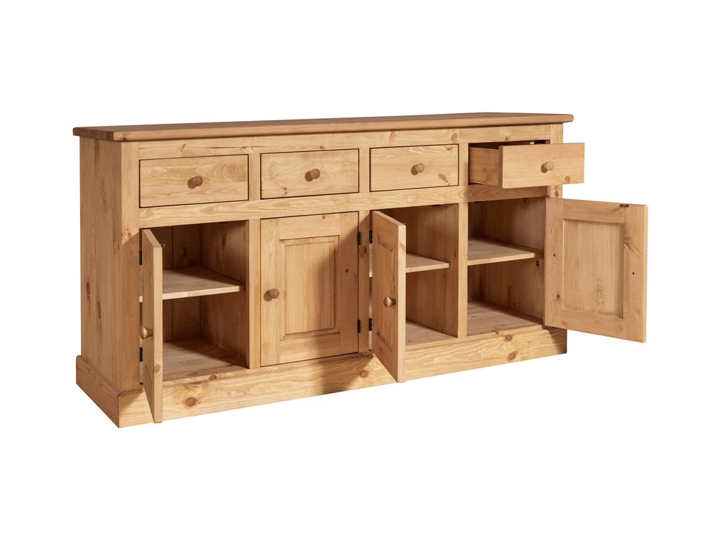 4 распашные дверки, 4 выдвижных ящика на деревянных полозьях. За каждой дверкой съёмная полка, которая делит пространство пополам по 230 мм. Сплошной цоколь.