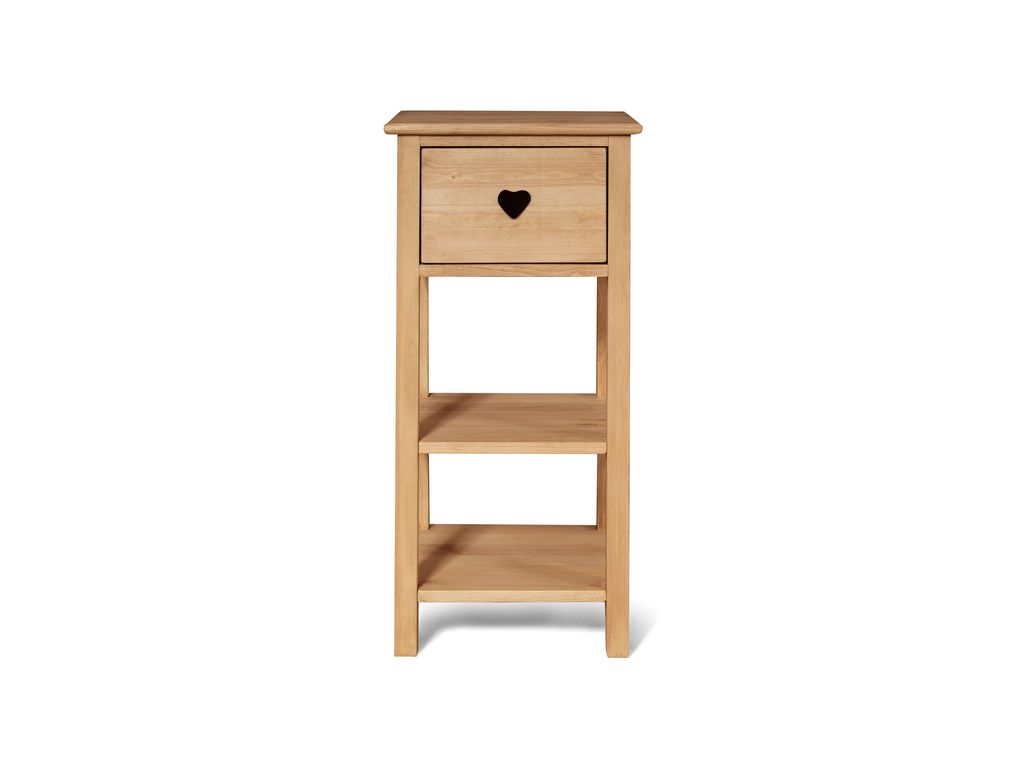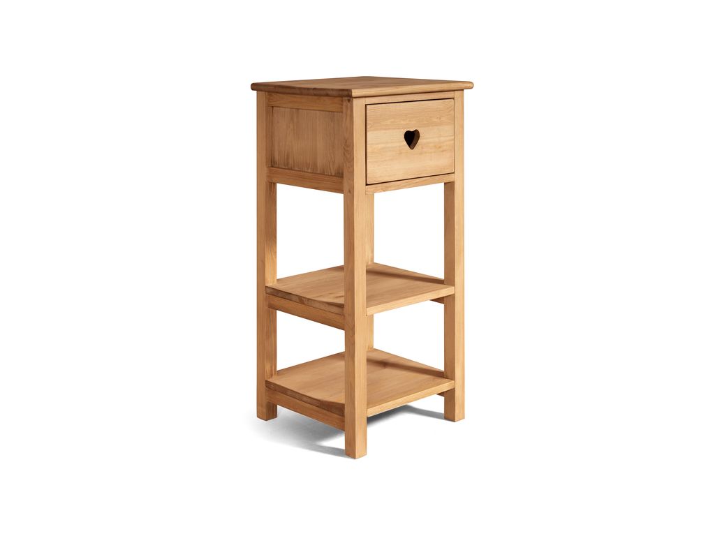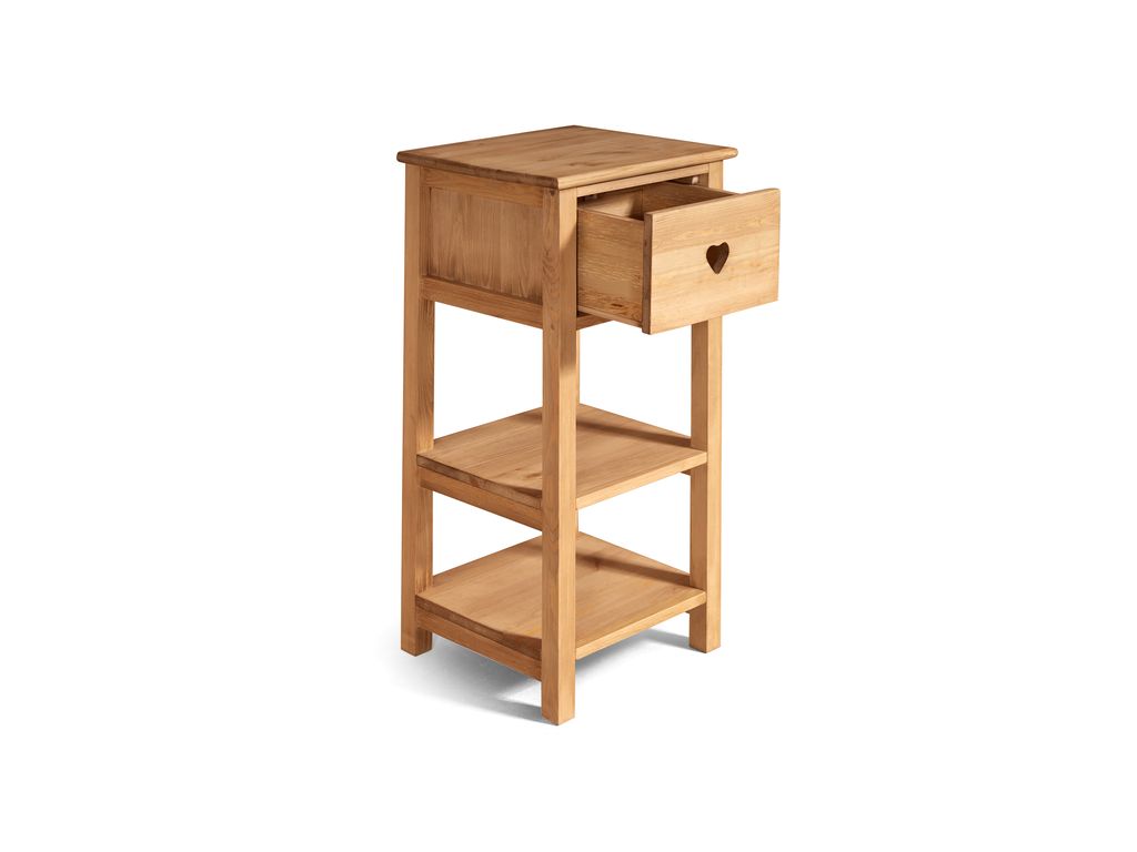 Имеет 1 ящик и 2 полки. Выдвижной ящик на деревянных полозьях с прорезанным сердечком.