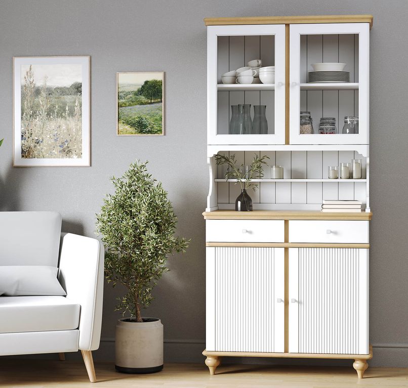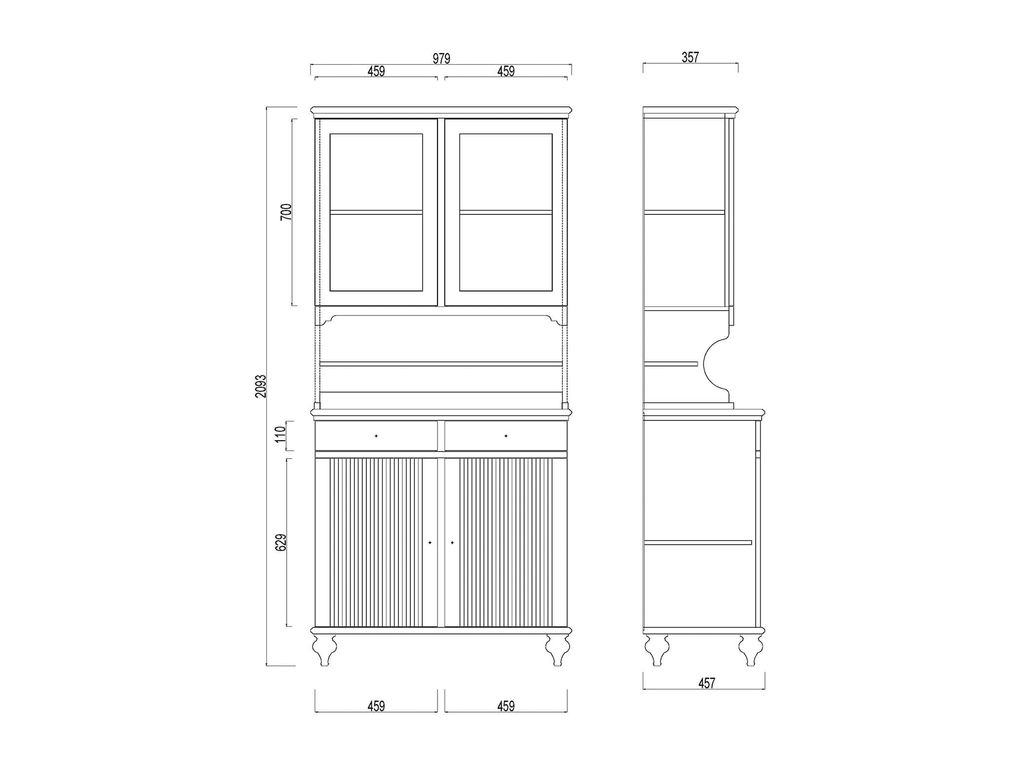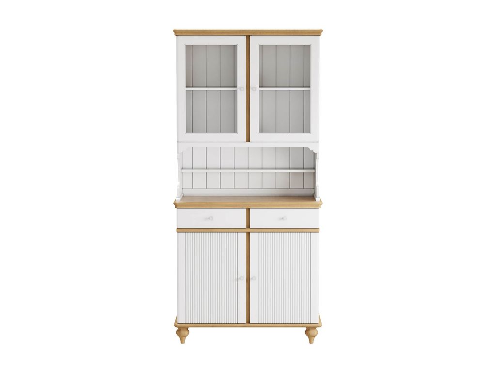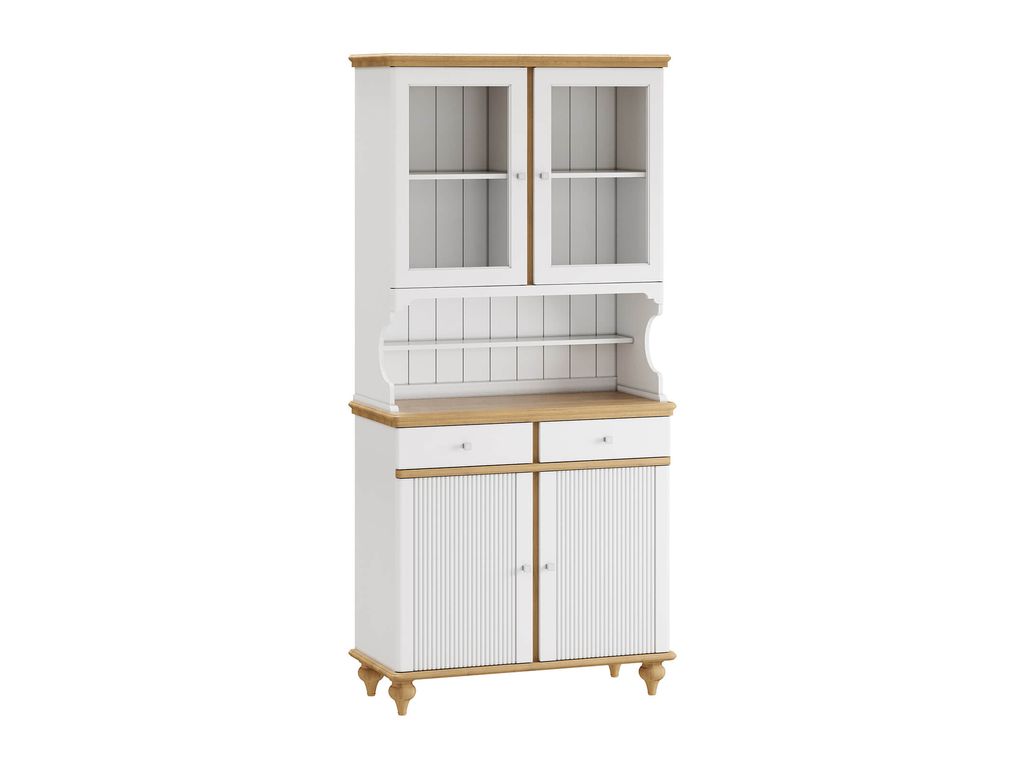 Описание: буфет оснащен двумя распашными дверками с полками внутри и двумя ящиками снизу, двумя распашными, стеклянными, дверками сверху. Фурнитура на дверях и ящиках с доводчиками.