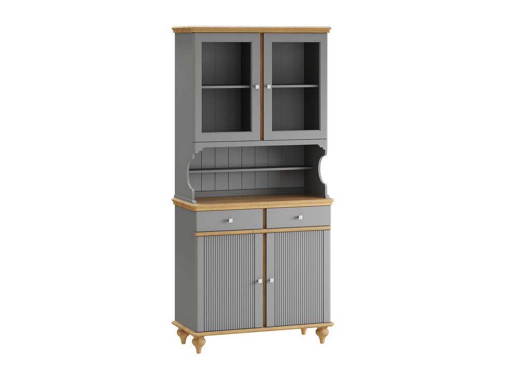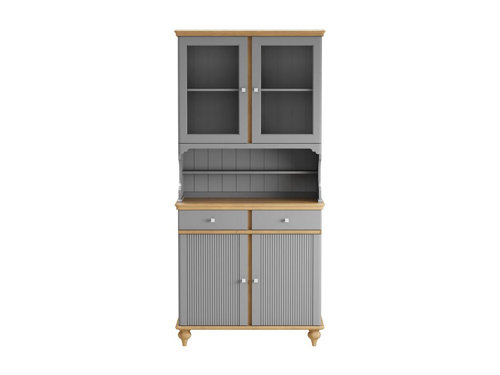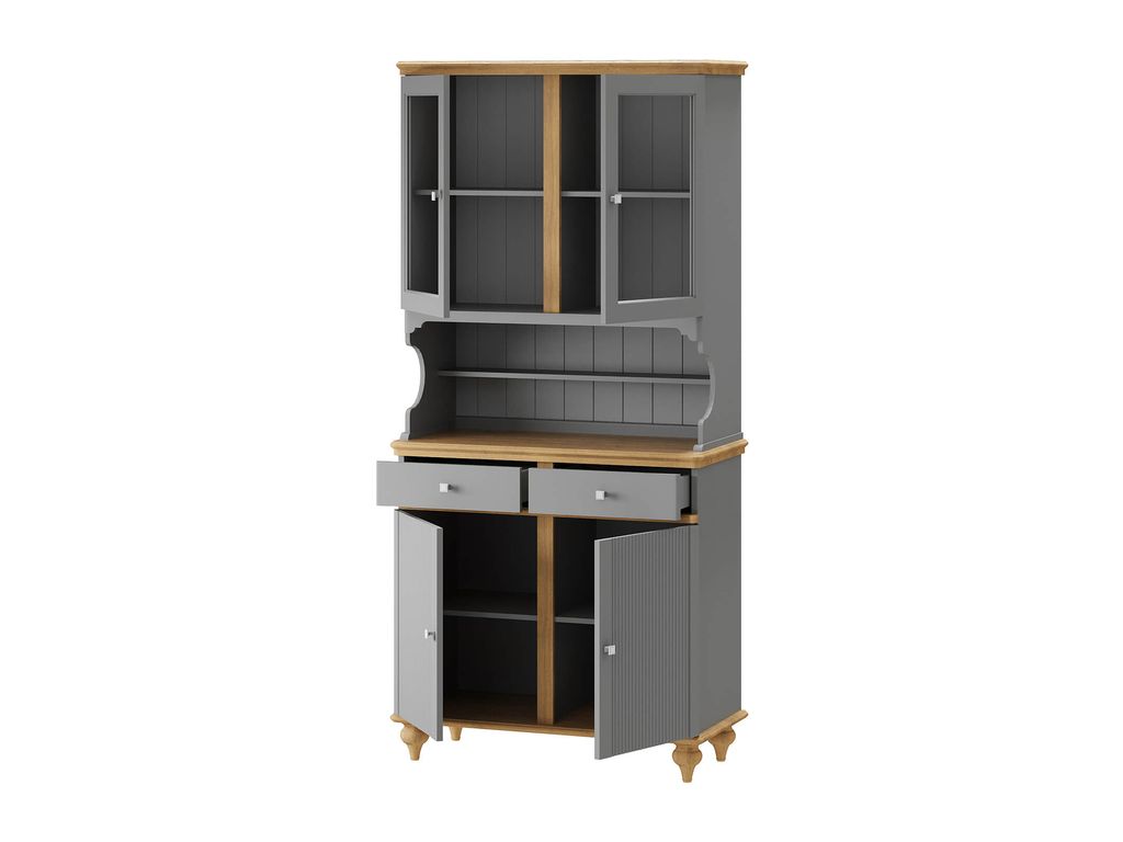 Описание: буфет оснащен двумя распашными дверками с полками внутри и двумя ящиками снизу, двумя распашными, стеклянными, дверками сверху. Фурнитура на дверях и ящиках с доводчиками.