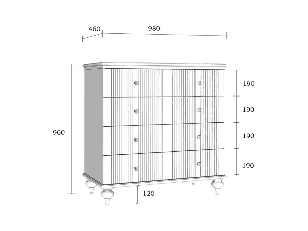 Описание: комод оснащен четырьмя широкими ящиками. Фурнитура на ящиках с доводчиками. Высокие ножки обеспечивают оптимальный доступ при уборке.