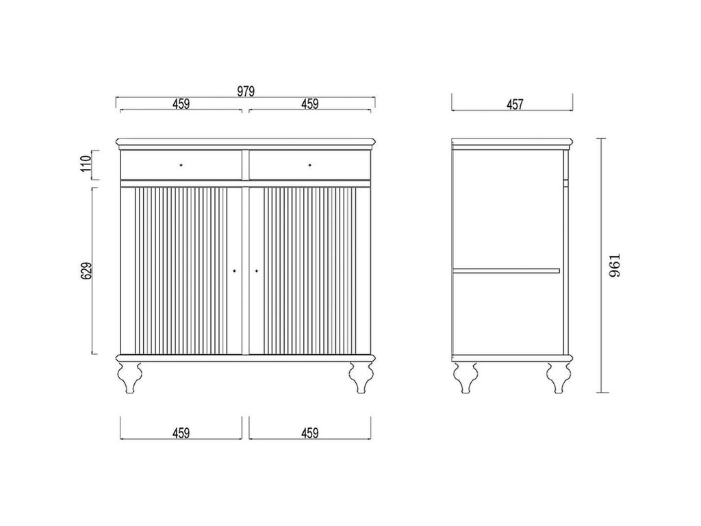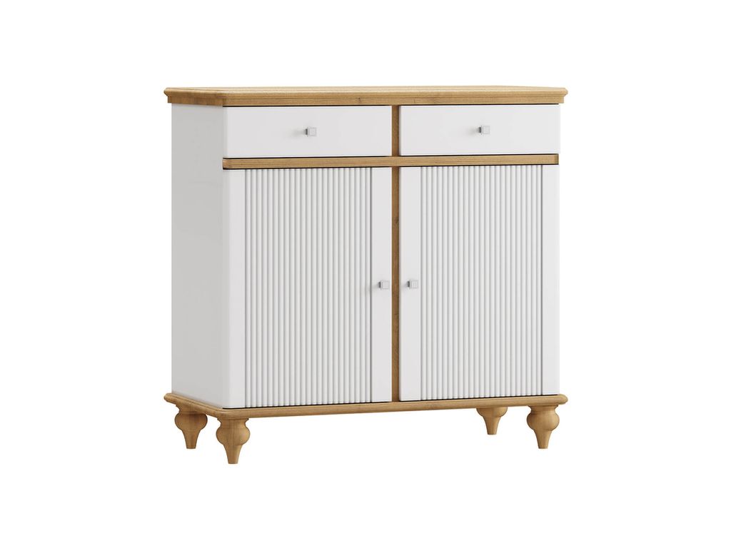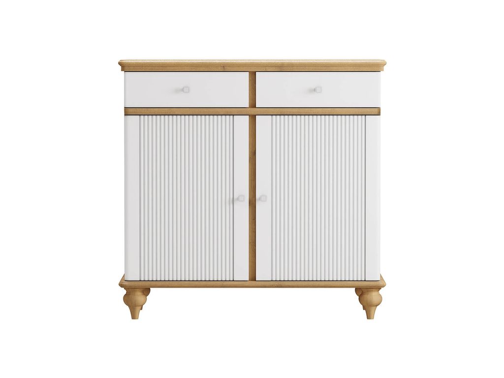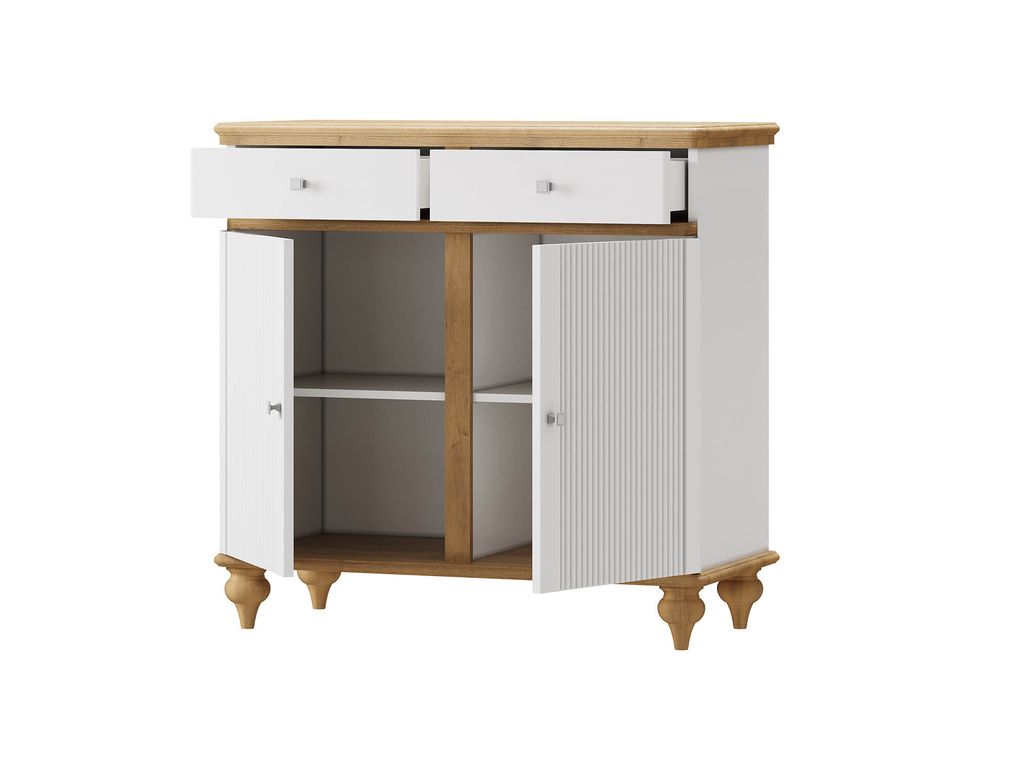 Описание: комод разделен на два отсека, в каждом из которых по одной полке за распашными дверями, сверху два выдвижных ящика. Фурнитура на дверях и ящиках с доводчиками.