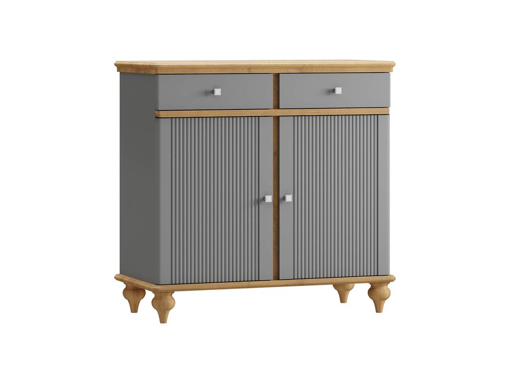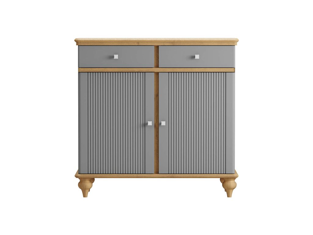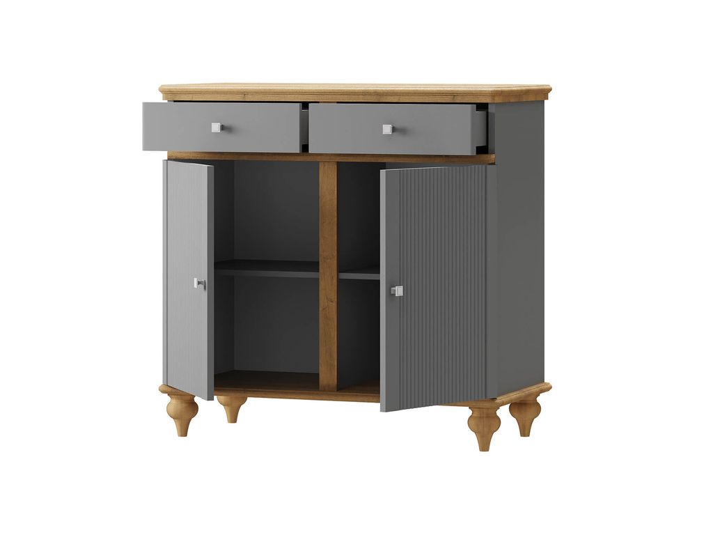 Описание: комод разделен на два отсека, в каждом из которых по одной полке за распашными дверями, сверху два выдвижных ящика. Фурнитура на дверях и ящиках с доводчиками.