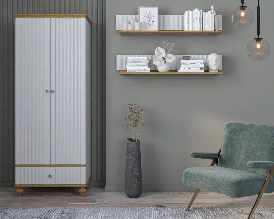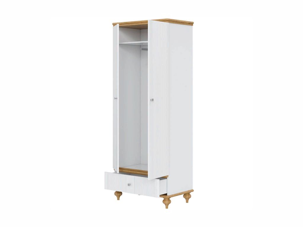 Описание: высокий шкаф с отделением для головных уборов, штангой и одним выдвижным ящиком.