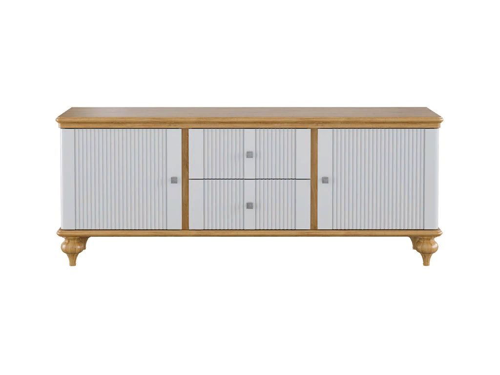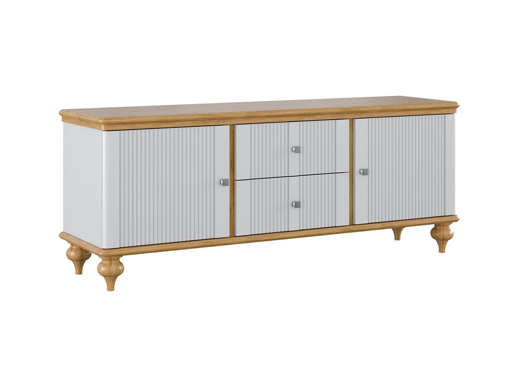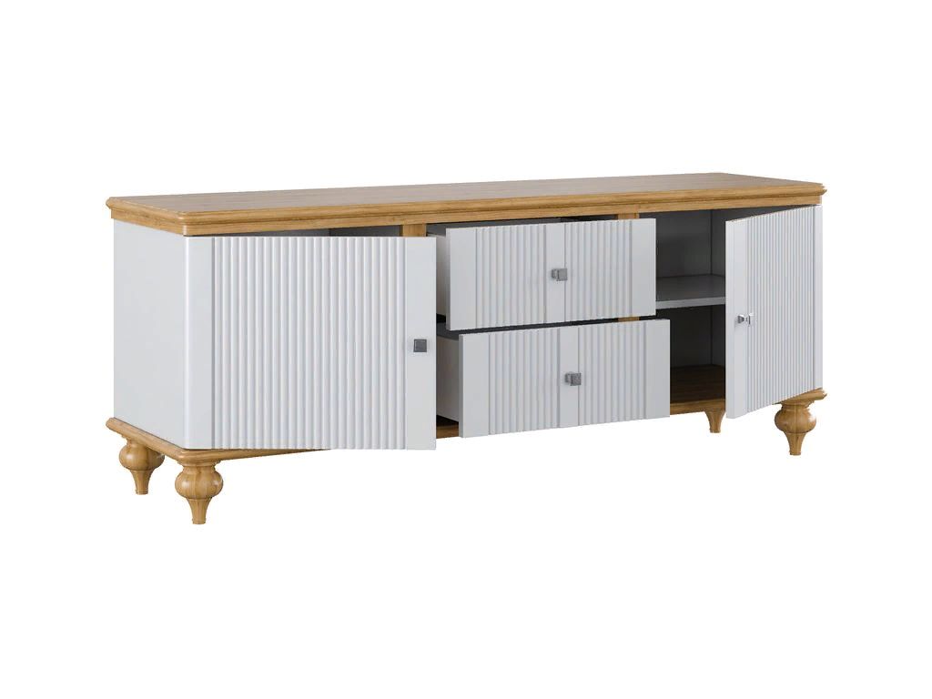 Описание: тумба ТВ оснащена двумя выдвижными ящиками и двумя полками за распашными дверями. Фурнитура на ящиках и дверях с доводчиками. Высокие ножки обеспечивают оптимальный доступ при уборке.